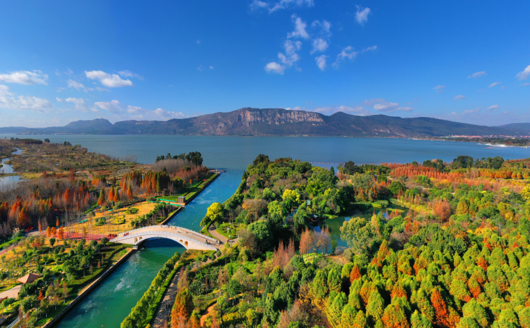 滇池绿道规划总长137公里,目前建成开放108公里。作为兼具景观与生态功能的绿道,全程架设了20余座跨河桥和13座栈道,串联起滇池周边资源,形成“傍山—瞰湖—穿林—近湿—踏田—连村”的多元特色,将滇池沿线43处主要湿地公园、2个历史文化名村、20余处美丽乡村串珠成链,融滇池美景与人文古韵于一体,不仅能打卡以“七彩云桥”“物语小桥”等为主题建设的特色栈桥、跨河桥,还能欣赏到根据滇池历史古景还原的“渔浦星灯”“海潮夕照”等,沿线分布的30余处观景平台。