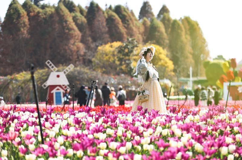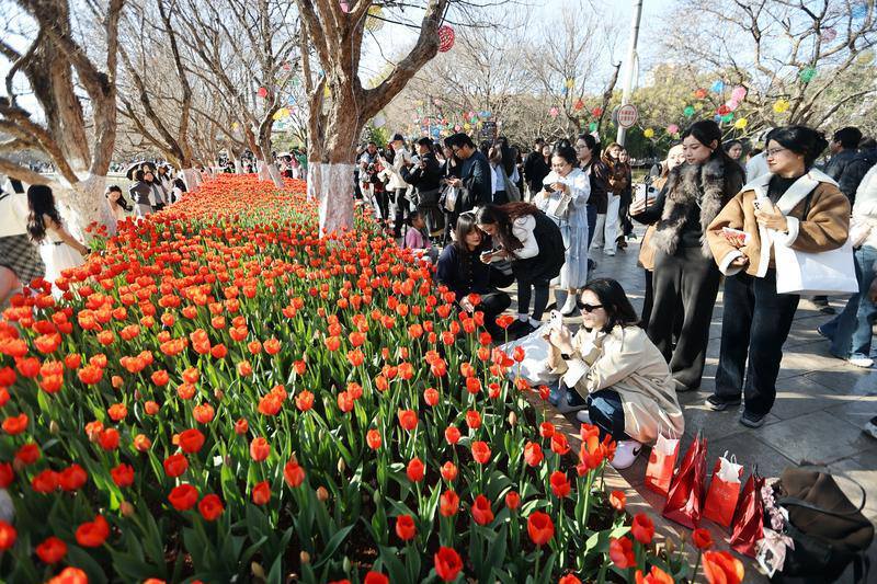 图为,翠湖公园内万株郁金香正值盛花期,各色花株争奇斗艳,吸引游客前来拍照。