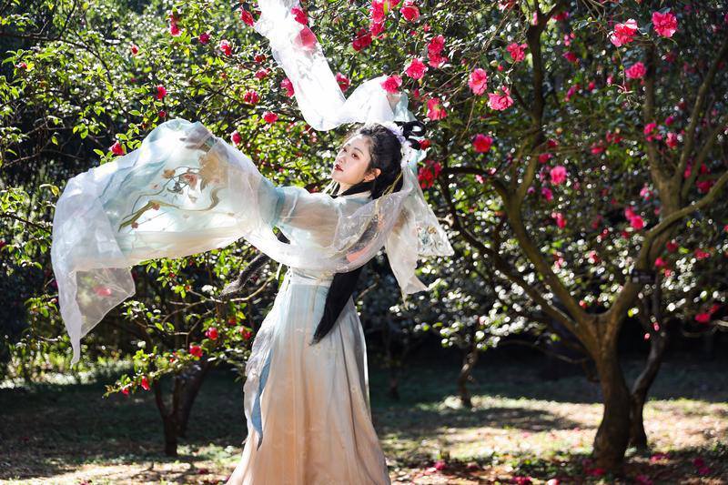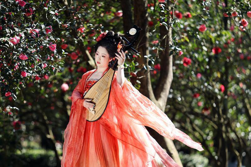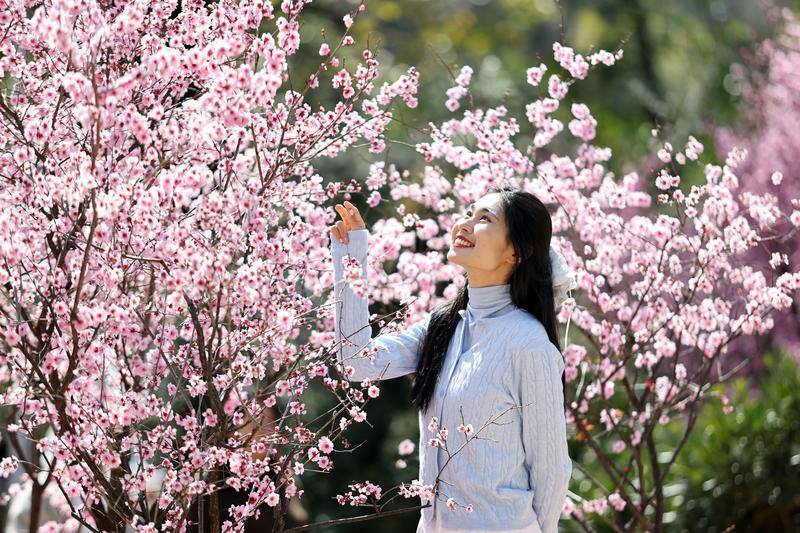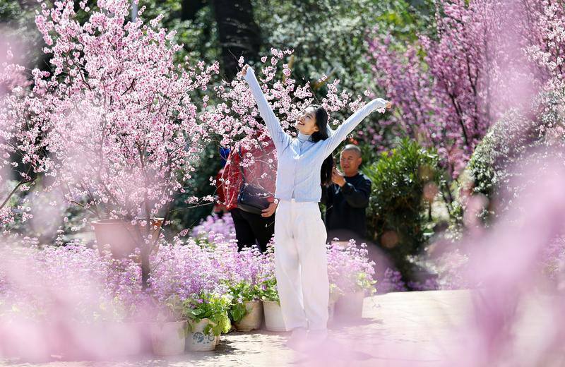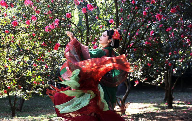 图为,昆明植物园东园,山茶花次第绽放,原生品种与新品种交织,身着汉服的游人,轻倚花枝、缓步游园,传统国风与春日花景相映成趣。