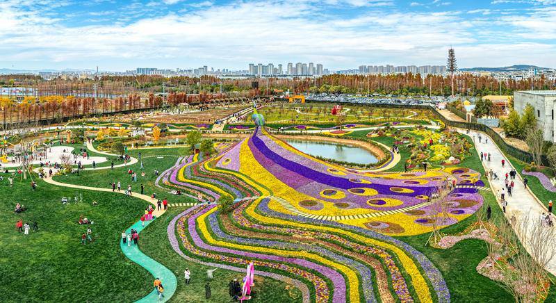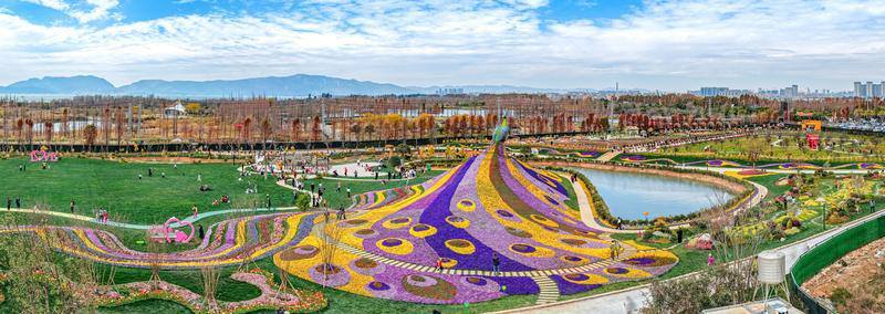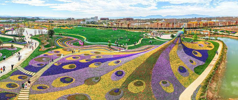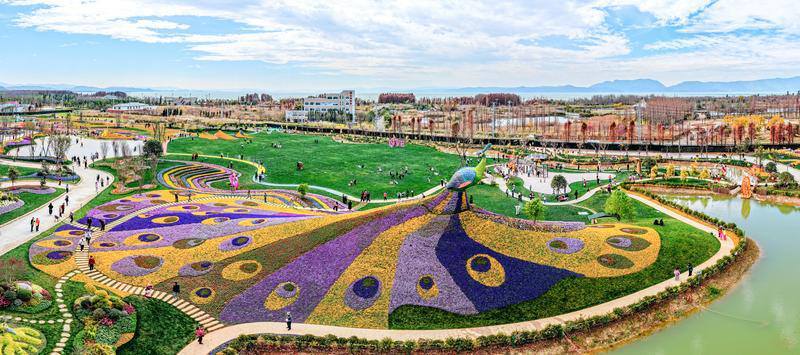 斗南七彩花海开门迎客,巨型“孔雀”与滇池勾勒出“山水花都、湖滨春城”的美景。