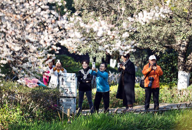 图为,昆明市黑龙潭公园,梅花如繁星璀璨,吸引了不少市民前来赏花。