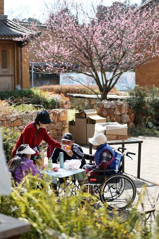 图为,卧龙古渔村内梅花盛开,市民在花下野餐。
