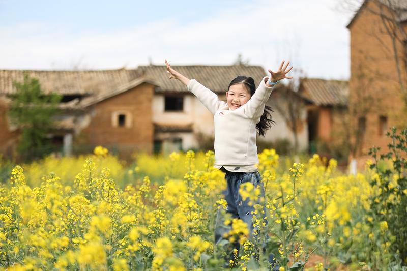 卧龙古渔村内,孩子在油菜花田内拍照打卡。