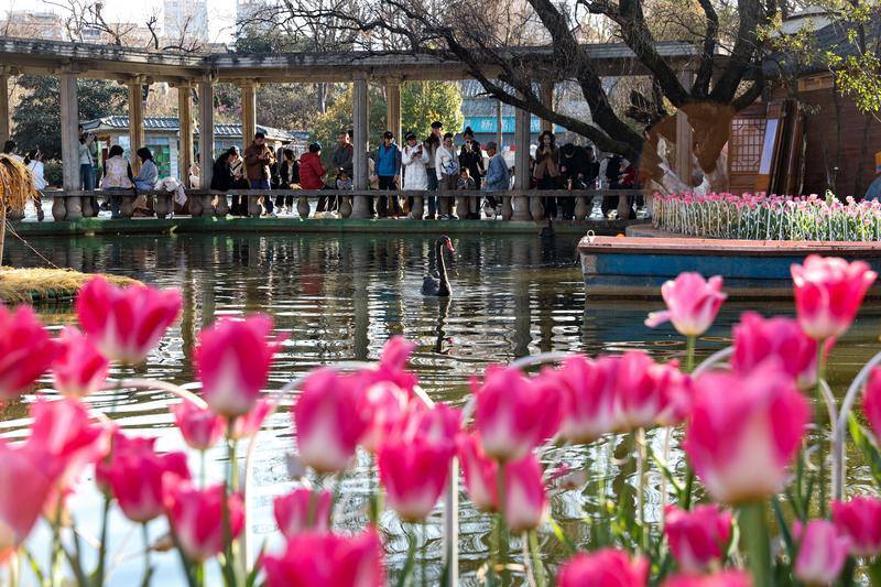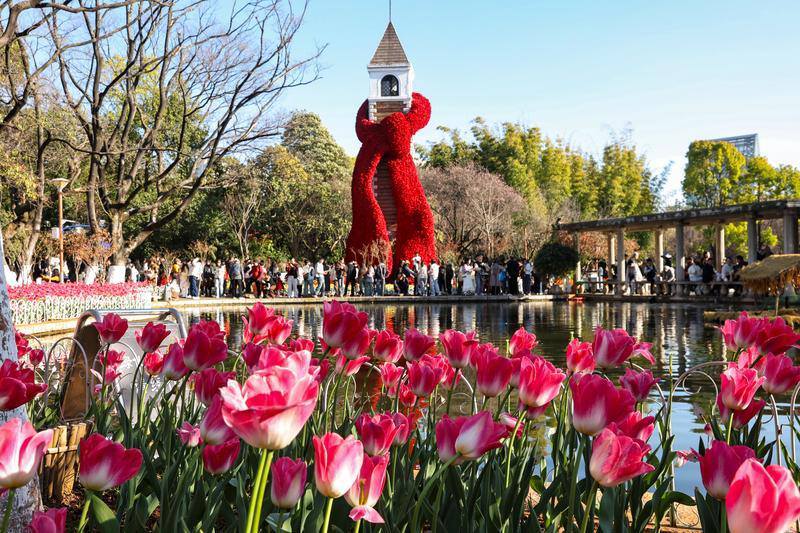 临近春节,翠湖公园、捞鱼河公园内,粉、白、红、黄各色郁金香次第在园内铺开,络绎不绝的游客沉醉于花海之中,以花为景,以碧水、蓝天为幕,记录下一幅幅惬意、浪漫的瞬间。