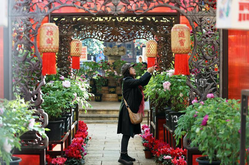 图为,昆明市昙华寺牡丹花展布展忙,市民抢先在展内一睹牡丹芳容。