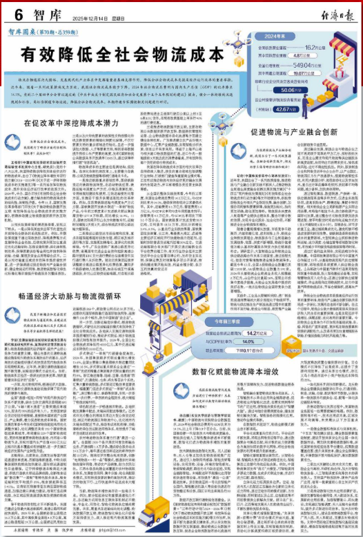 孙启鹏(长安大学经济与管理学院院长、教授):中国物流与采购联合会数据显示,2024年社会物流总费用与GDP比率为14.1%,比上年下降0.3个百分点。当前,我国推动新一代信息技术与物流深度融合,物流供应链人工智能整体渗透率不断提高,数智化已成为物流降本增效的重要途径。