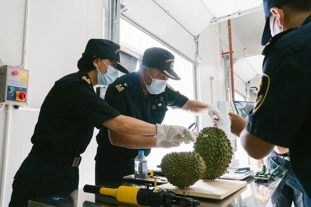 装载榴莲冷链集装箱的货船抵达西双版纳海关,海关正在开展作业。史焜宇 摄