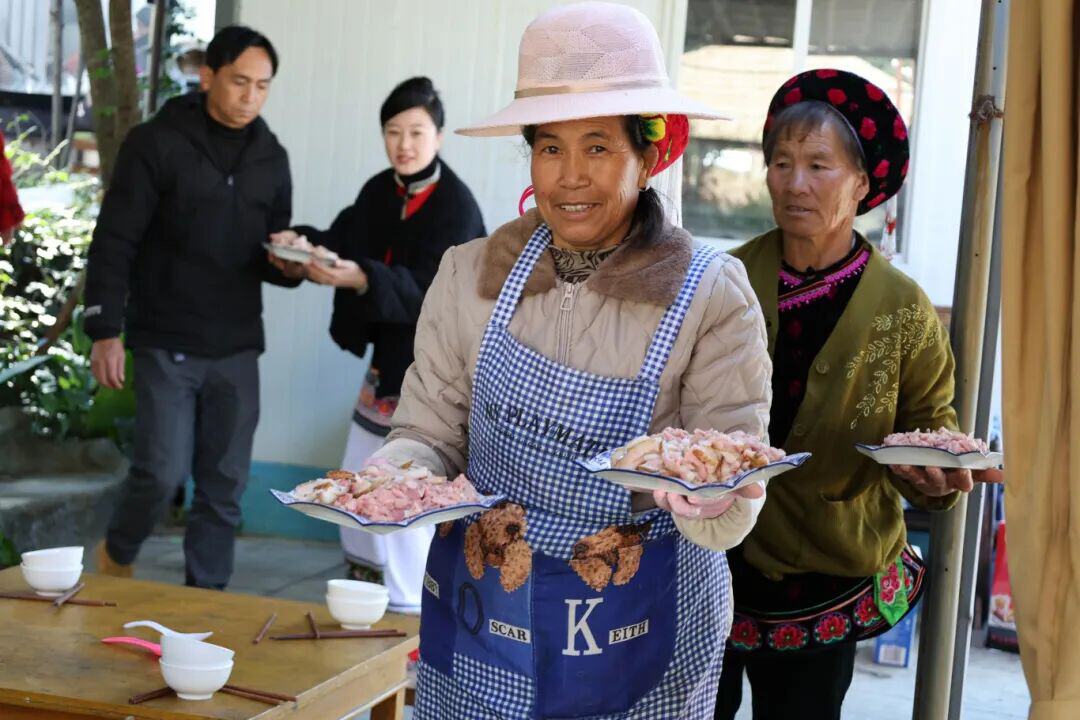 杀猪饭从不是一家人的忙碌。罗平的村民陈其斌家,“三五成群的乡邻们早早赶来帮忙,有的烧水备桶,有的磨利刀具,有的整理案板,分工明确又默契十足”;大理的村寨里,“杀猪不只是一家人的事,而是全村男女老少齐齐上阵的热闹大事”;墨江的小院中,“众人分工协作、各司其职,洗切烹煮有条不紊”。山水相连的村寨间,这份无需言说的互助,让杀猪饭的烟火气有了最温暖的底色。