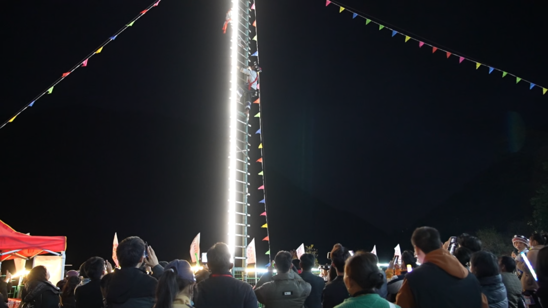 当晚的活动在震撼人心的“上刀山下火海”表演中拉开序幕。傈僳族勇士们空拳赤脚,一步步攀上险峻的“刀山”,在杆顶完成开天门、挂红、撒谷等祈福仪式;夜幕下,他们又踏入通红炽热的炭火中穿梭往复,展现“下火海”的绝技。