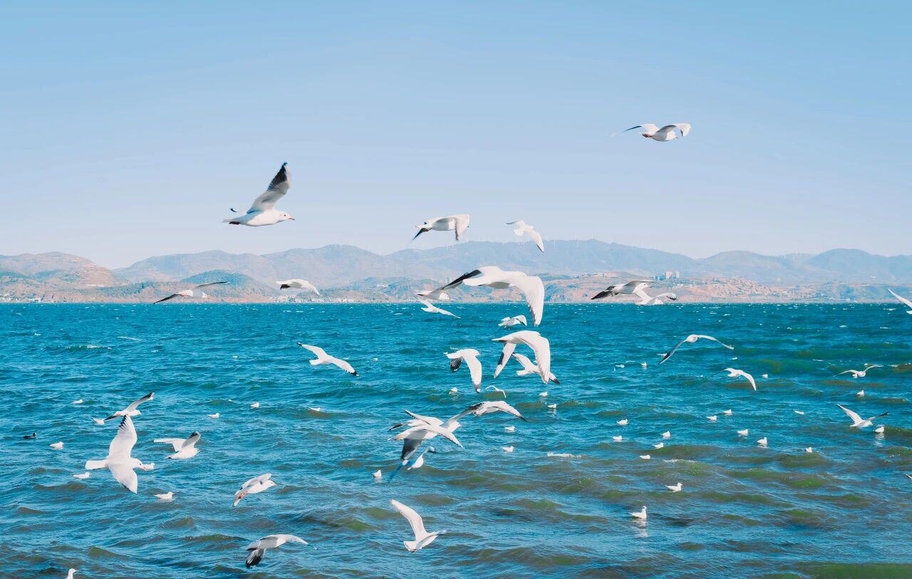 天蓝水清,海鸥翔集