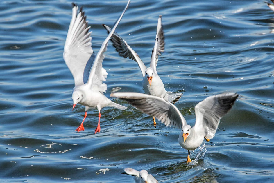 海鸥成群掠过水面