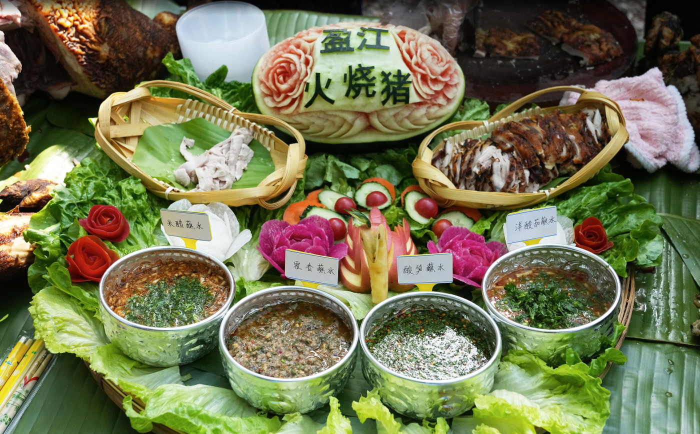 这就是盈江傣家人待客的“硬菜”——火烧猪。其制作技艺,在2022年入选云南省非物质文化遗产代表性项目;2023年被评为滇菜“一州一菜”。换言之,这道菜,就是德宏人家的招牌菜。