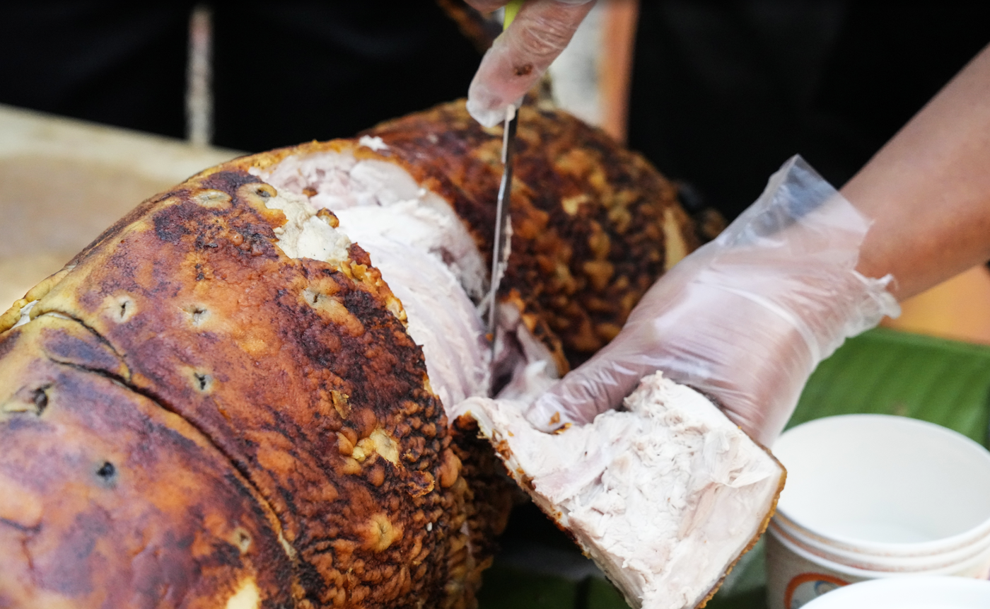 相比起来,这样的比拼场面对外地游客的震撼就更强烈了——当20余头小耳猪一起上架烘烤,然后一字排开供人品鉴,闻之香气四溢,尝之外焦里嫩,简直让人香掉舌头。
