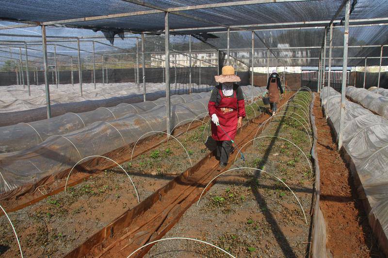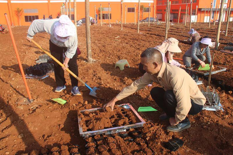 “我们苗圃共育有7个品种,今年计划育苗800万株,目前已全部完成,正准备移栽到营养袋上。”在临沧市镇康县南伞园区的云南镇康哈里咖啡良种繁育核心基地的苗棚里,56岁的基地负责人唐大和一边介绍情况,一边细心观察着咖啡苗的长势。“瑰夏是当前优质品种,今年基地培育了200万株,黄波旁、撒奇莫402、罗布斯塔各100万株……” 清晨的阳光穿过云层,照在育苗棚外不远处的一块空地上,20余名工人正在疏土、整地、套袋、架模、填土……他们分工明确、配合默契,一排排安装好的营养袋整齐排列,正在等待新苗的移栽,现场一派繁忙景象。