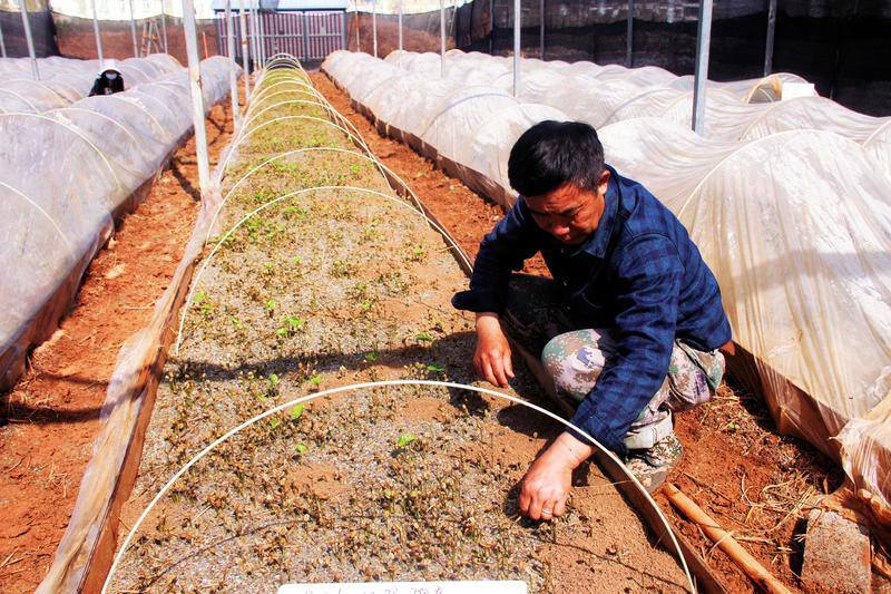 基地负责人唐大和正在苗棚里查看咖啡苗长势。