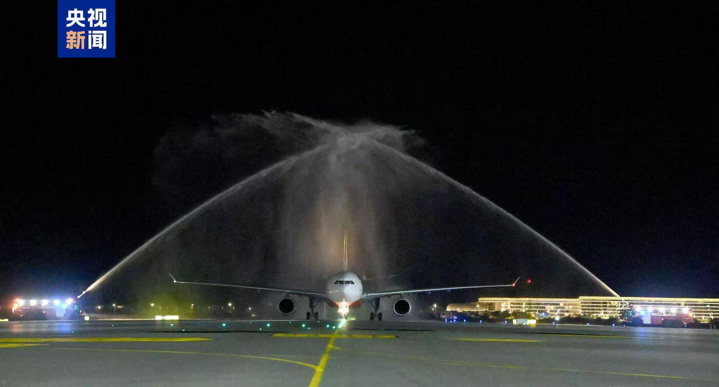 △11月30日,首条由中国航司运营的中阿(曼)直飞航线完成首航,马斯喀特国际机场为首航航班举行“过水门”仪式。