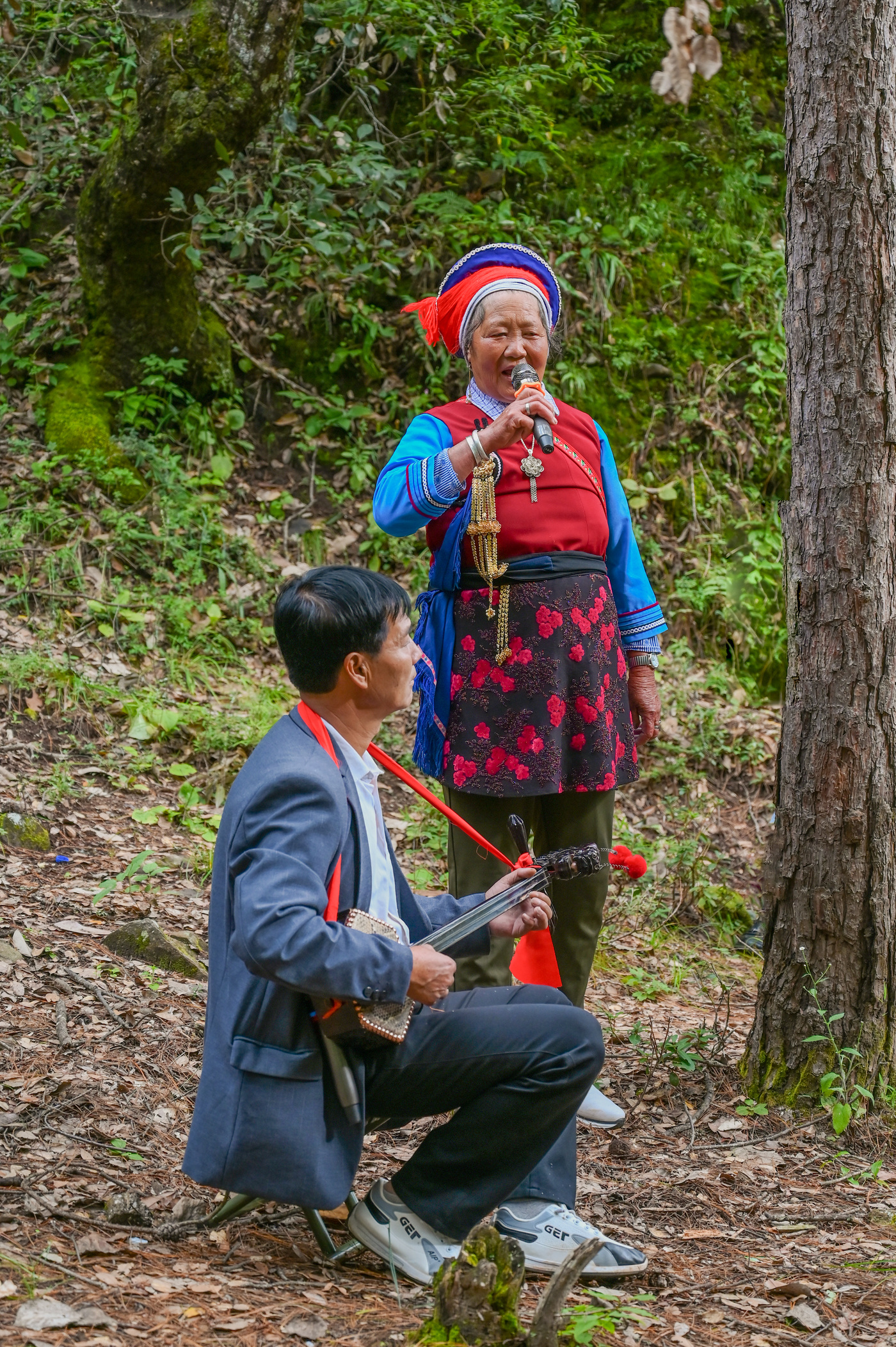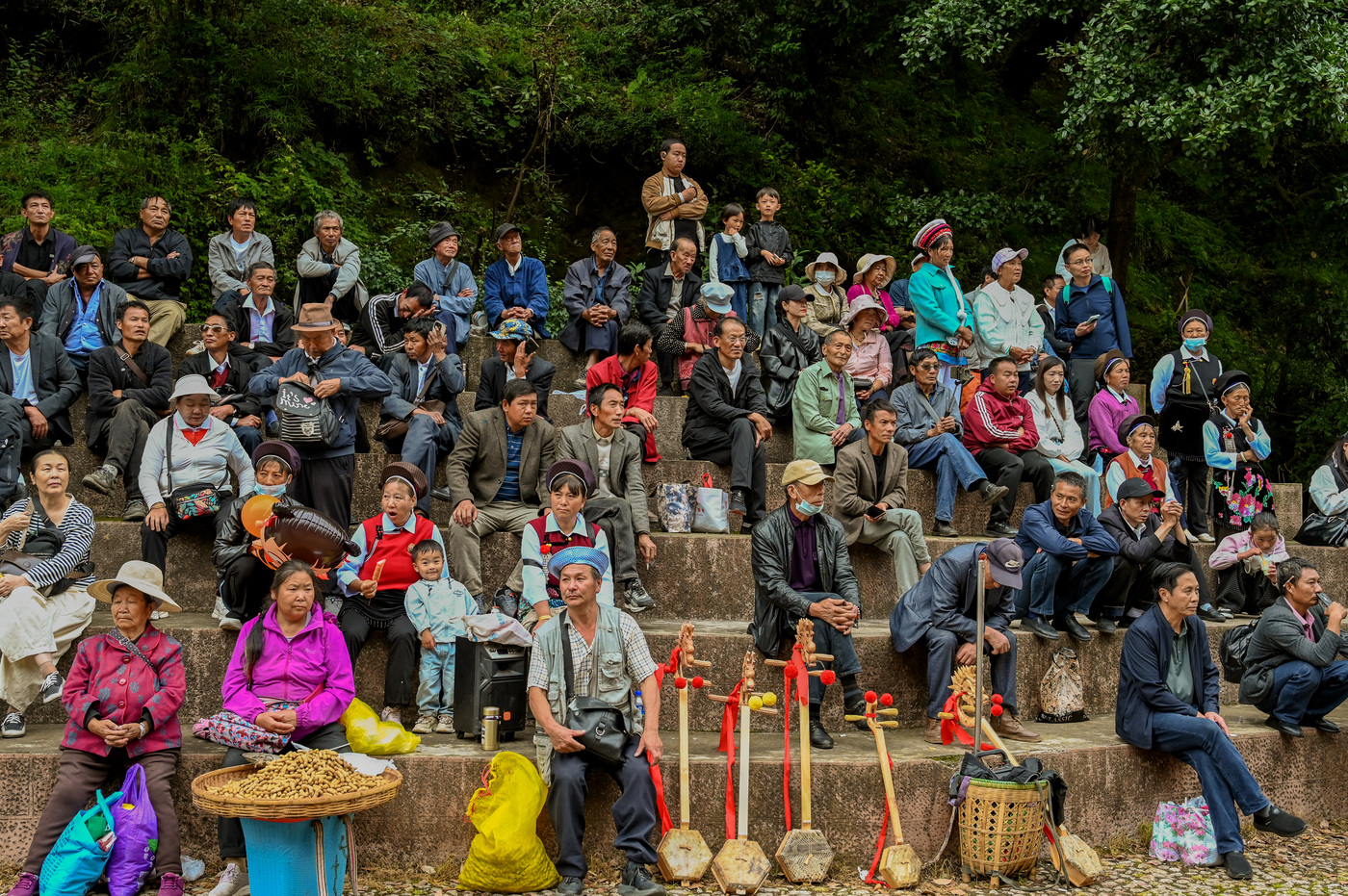 一大早,开唱仪式在石宝山对歌台启动,台上台下、人声鼎沸、弦歌不歇,男女老幼身着节日盛装,即兴对歌、弹弦唱曲,场面热闹非凡。