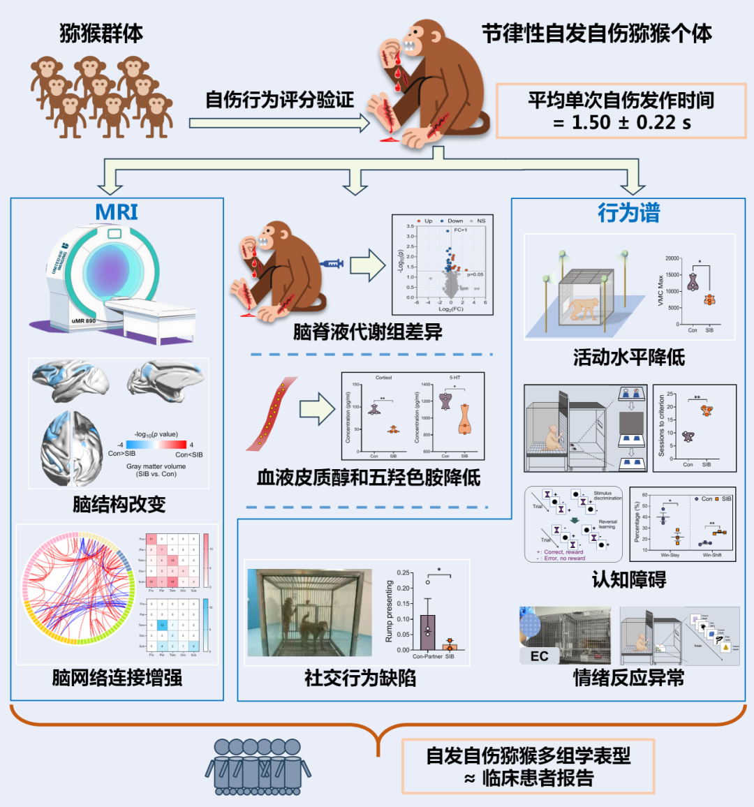 转机来自昆明动物研究所的观察:饲养的猕猴群体中,个别猕猴会“自发”持续性自伤行为。研究团队依托灵长类设施,对这些“自伤猕猴”展开全方位研究,包括观察行为、检测血液与脑脊液指标、分析脑部影像学特征等,并与人类NSSI患者数据对比。