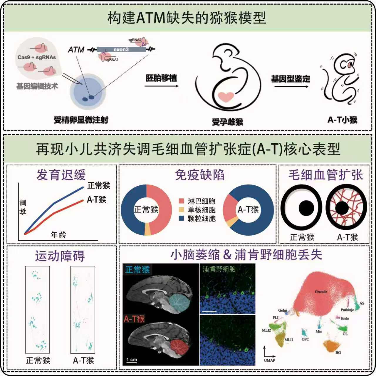 近日,昆明动物研究所团队首次用CRISPR-Cas9基因编辑技术,在猕猴胚胎中“敲除”ATM基因,成功培育出ATM功能缺失的猕猴模型。令人振奋的是,这些猕猴出生后,逐渐表现出与A-T患儿几乎一致的症状:生长慢于同龄猕猴,免疫力差易生病,眼结膜出现毛细血管扩张,血液甲胎蛋白水平升高,对辐射更敏感,还完整再现了“小脑萎缩”和“运动失调”——脑部磁共振成像(MRI)可见小脑体积逐渐缩小,下肢运动愈发不灵活,病理检测发现小脑内负责运动控制的细胞数量减少,且出现退化特征。