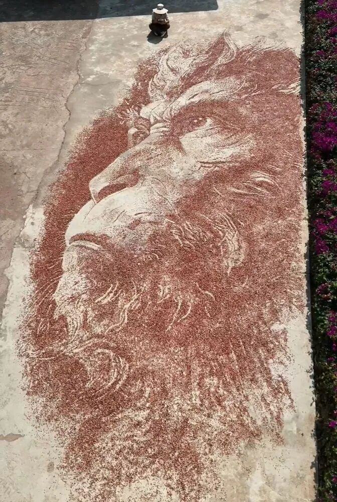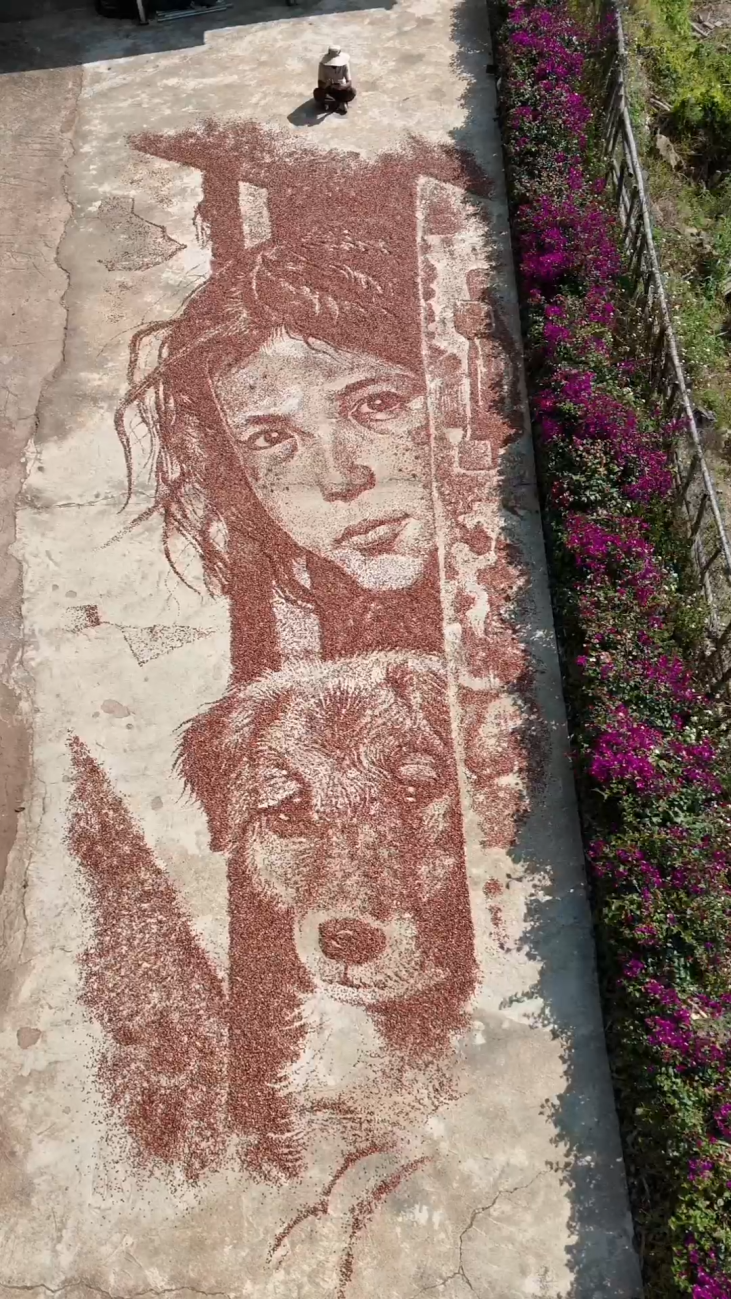 晒玉米,本是山里人家再寻常不过的农事。金黄的玉米棒铺满房顶、晒场,是乡村最朴实的一道风景。但在普洱市镇沅县按板镇宣河村驻村第一书记宁思手里,这满地的红玉米,不再只是庄稼,而成了画笔下的“颜料”,大地成了画布,丰收被“晒”成了一幅幅令人惊叹的巨幅画作。