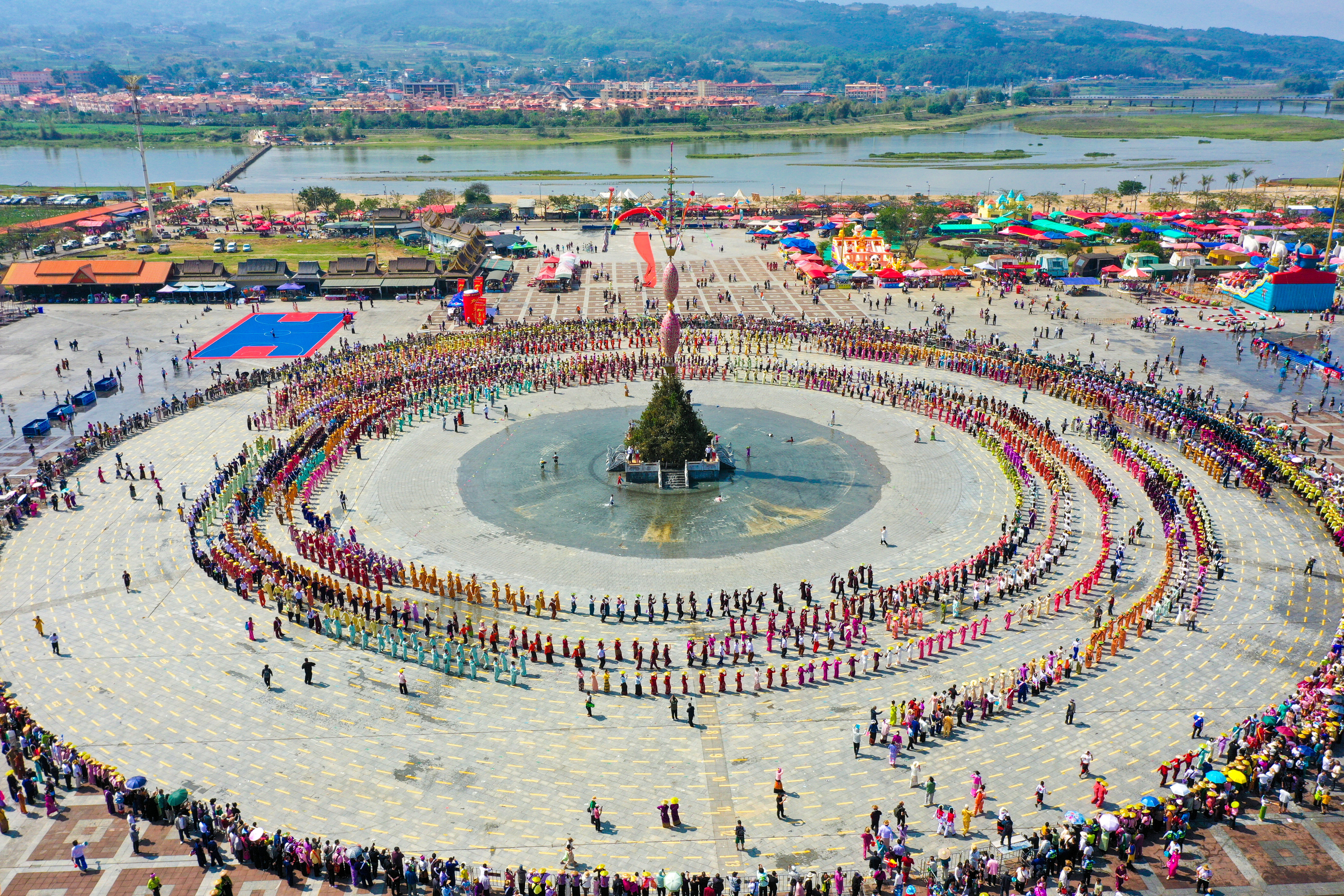4月11日,继第五届盈江“火烧猪”美食大赛预热后,盈江2026年傣族德昂族泼水狂欢活动在全国最大的江边广场——傣文化园泼水广场迎来高潮。开幕式上,傣拳傣棍、傣剧选段、“光邦”小鼓演奏、德昂族舞蹈轮番上演,尽显民族文化瑰宝;展演完毕,万众期待的“万人嘎伴光”联欢活动随即开始,人们围着“赏建”树,踏着欢快的鼓点翩跹起舞,场面蔚为壮观。
