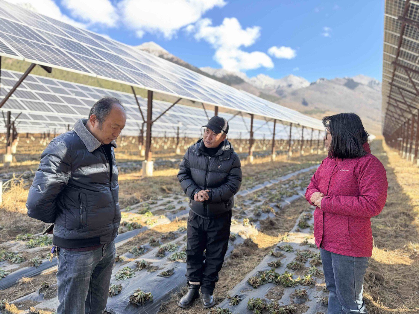 隆冬时节,艳阳高照。位于丽江市玉龙纳西族自治县宝山乡的华电(玉龙)新能源开发有限公司大坪坝光伏基地里,成片的光伏板在阳光下熠熠生辉,将炽热的太阳能源源不断地转化为清洁电能;在光伏板的间隙里,喜阴耐寒的国家Ⅱ级保护濒危中药材胡黄连蓬勃生长。丽江玉龙秋实农业开发有限公司与云南农业大学在这里合作建成规模达260亩的国内首个“胡黄连-药光互补”示范基地,成功实现板上发电、板下种药,以科技力量推动高寒山区产业发展、农民增收。