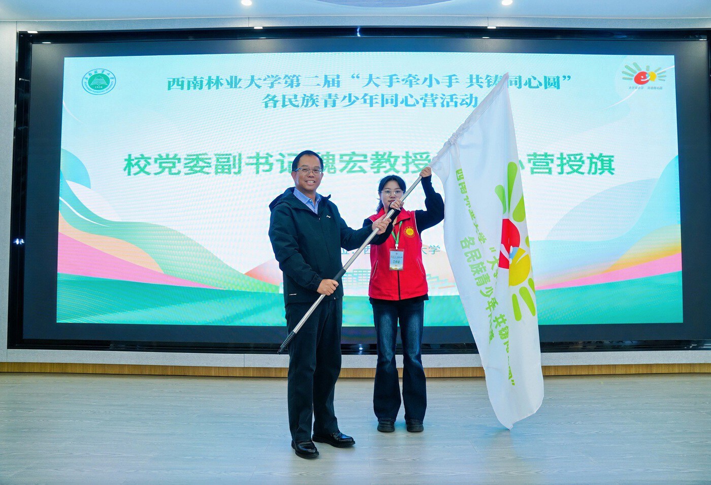 开营仪式上,西南林业大学党委副书记魏宏为同心营授旗,并以“开营第一课”的形式,为同学们讲授民族团结进步教育课。他以深入浅出的方式引导同学们深刻认识中华民族“休戚与共、荣辱与共、生死与共、命运与共”的共同体内涵,并寄语全体学员在共同生活中学会彼此欣赏、互帮互助,在践行中感悟“各美其美、美美与共”的深刻内涵。