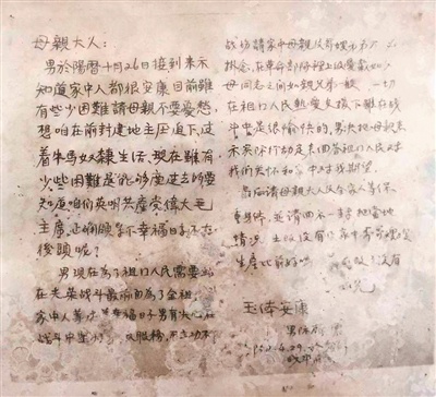 黄继光1951年3月报名参加中国人民志愿军,曾任志愿军第15军45师135团2营通信员。1952年4月29日,入朝作战1年的黄继光在战斗间歇,给妈妈邓芳芝写了一封信。