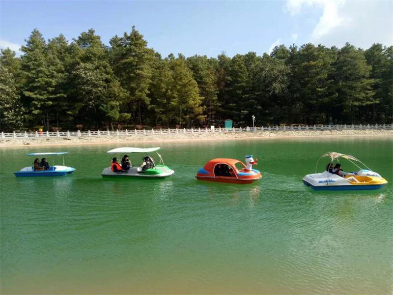 沿着石阶一直往上走,就到了山顶的平顶玉湖。湖泊掩映于青松翠柏之间,给这座山带来无穷的灵气。湖面放置了观光游艇,游客泛舟湖面,犹如在画中游。