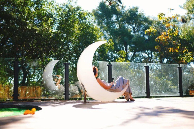 除了住房,“陌上云来”还有露天茶吧、微型高尔夫球场、露天电影和KTV等,简直就是一处吃喝玩乐住齐全的“休憩之所”。特别是森林天台,这里绿林花海环绕,桌、椅、沙发等一应俱全,可尽情观景、聊天、游玩、小憩。