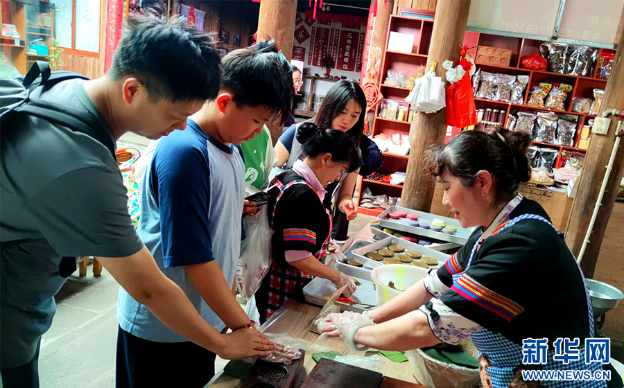 游客体验大米粑粑制作技艺(8月6日摄)。新华网发(韩文萍 摄)