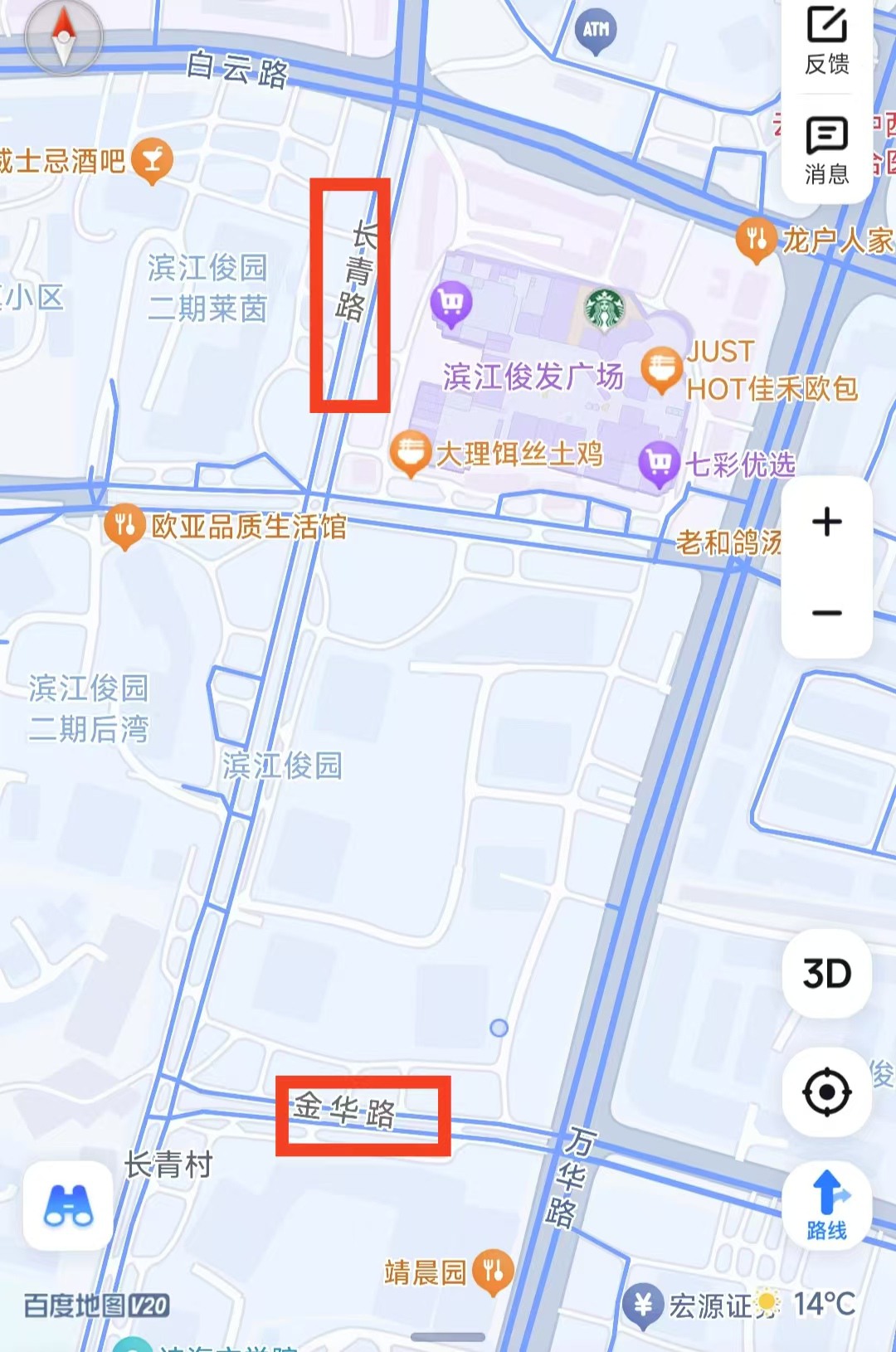 记者在该位置看到,群众反映路段呈“土”字形,共涉及拦路闸机5处。主干道一端设置有“滨江商业大道”的大门,道路中段设置有“长青路”的市政道路标牌,并且记者查询百度及高德地图,相关道路均显示为“长青路”和“金华路”。此外,该路段还设置有两个公交车站,但均被车辆停满疑似未启用。