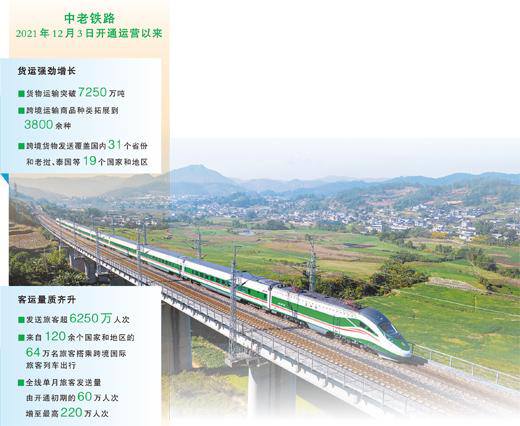 2021年12月3日开通运营以来,北起中国昆明、南抵老挝万象的中老铁路,已经成为一条联通内外、辐射周边、双向互济的黄金大通道,客货运量持续增长,服务品质显著提升,辐射带动效应持续放大,有力促进了沿线地区开放发展。