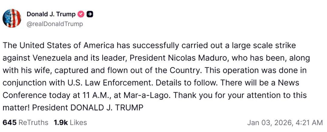 特朗普称,美国已成功对委内瑞拉及其领导人马杜罗总统实施了大规模打击,马杜罗及其妻子已被抓获并乘飞机离开该国。此次行动是与美国执法部门联合进行的。后续细节将陆续公布。