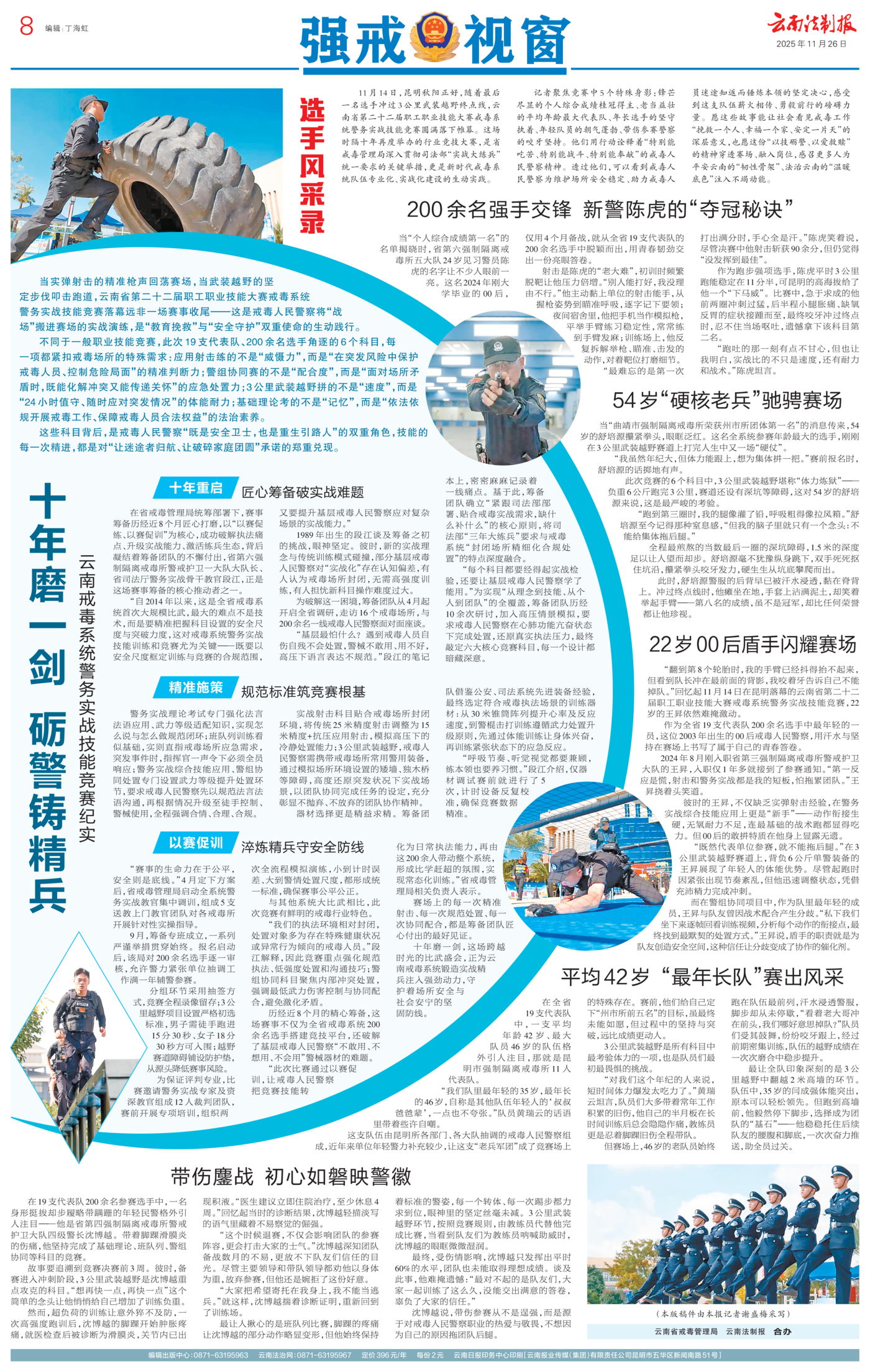 记者聚焦竞赛中5个特殊身影:锋芒尽显的个人综合成绩桂冠得主、老当益壮的平均年龄最大代表队、年长选手的坚守执着、年轻队员的朝气蓬勃、带伤参赛警察的咬牙坚持。他们用行动诠释着“特别能吃苦、特别能战斗、特别能奉献”的戒毒人民警察精神。透过他们,可以看到戒毒人民警察为维护场所安全稳定、助力戒毒人员迷途知返而锤炼本领的坚定决心,感受到这支队伍薪火相传、勇毅前行的磅礴力量。愿这些故事能让社会看见戒毒工作“挽救一个人、幸福一个家、安定一片天”的深层意义,也愿这份“以技砺警、以爱救赎”的精神穿透赛场、融入岗位,感召更多人为平安云南的“韧性骨架”、法治云南的“温暖底色”注入不竭动能。