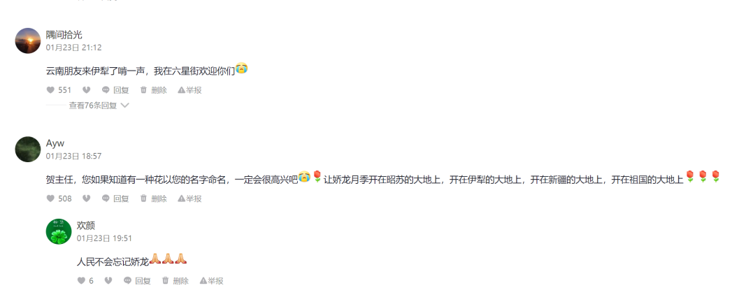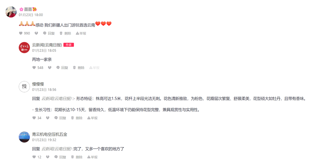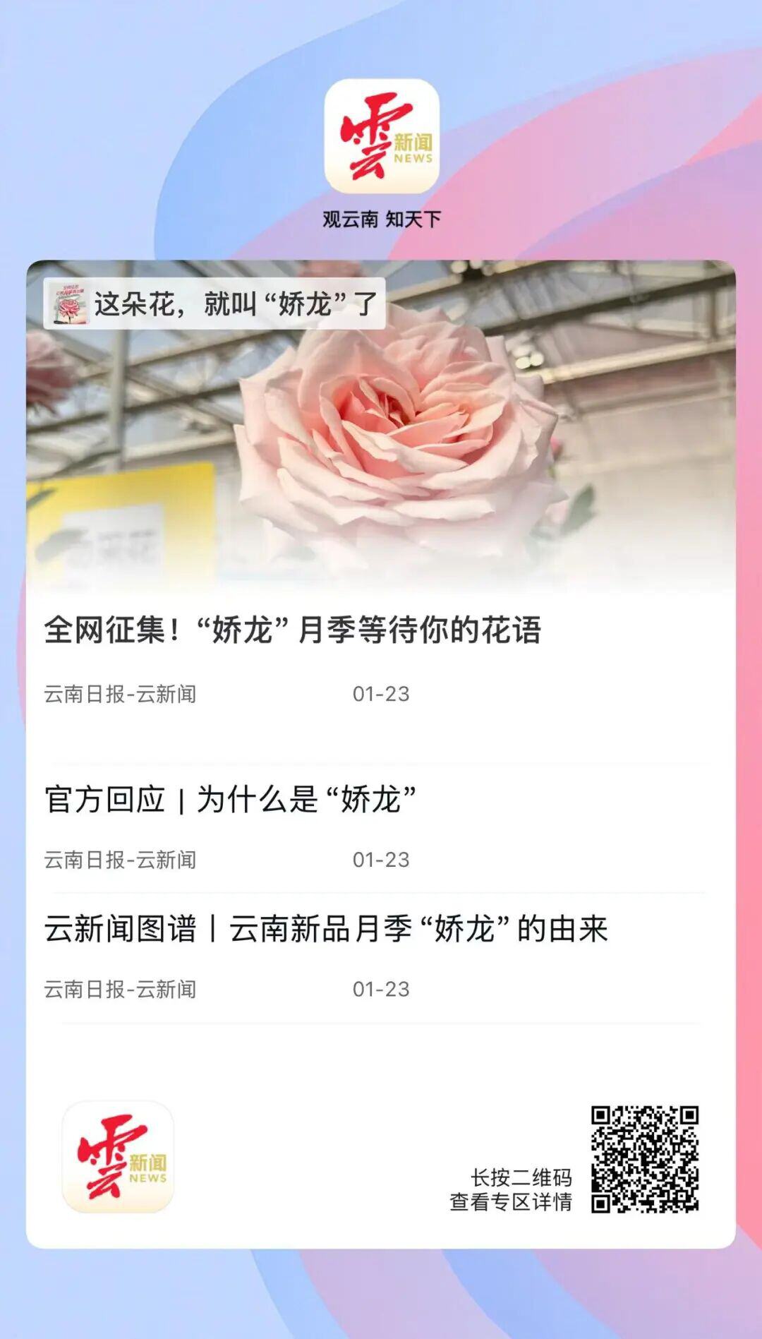 1月23日,云新闻客户端正式发布公告:征名活动提前终止,“中国芯”月季定名“娇龙”。公告一经推送,评论区化身为一个跨越山海的温暖驿站。一位新疆网友留言:“云南人来伊犁那拉提,我的民宿打5折!”紧接着,云南网友的回复刷屏:“欢迎新疆朋友来云南赏‘娇龙’,我当向导!”两地网友的双向邀约、千万人的真情共鸣,让这场征名活动超越了“给花起名”本身,成为一次正能量的集体传递。