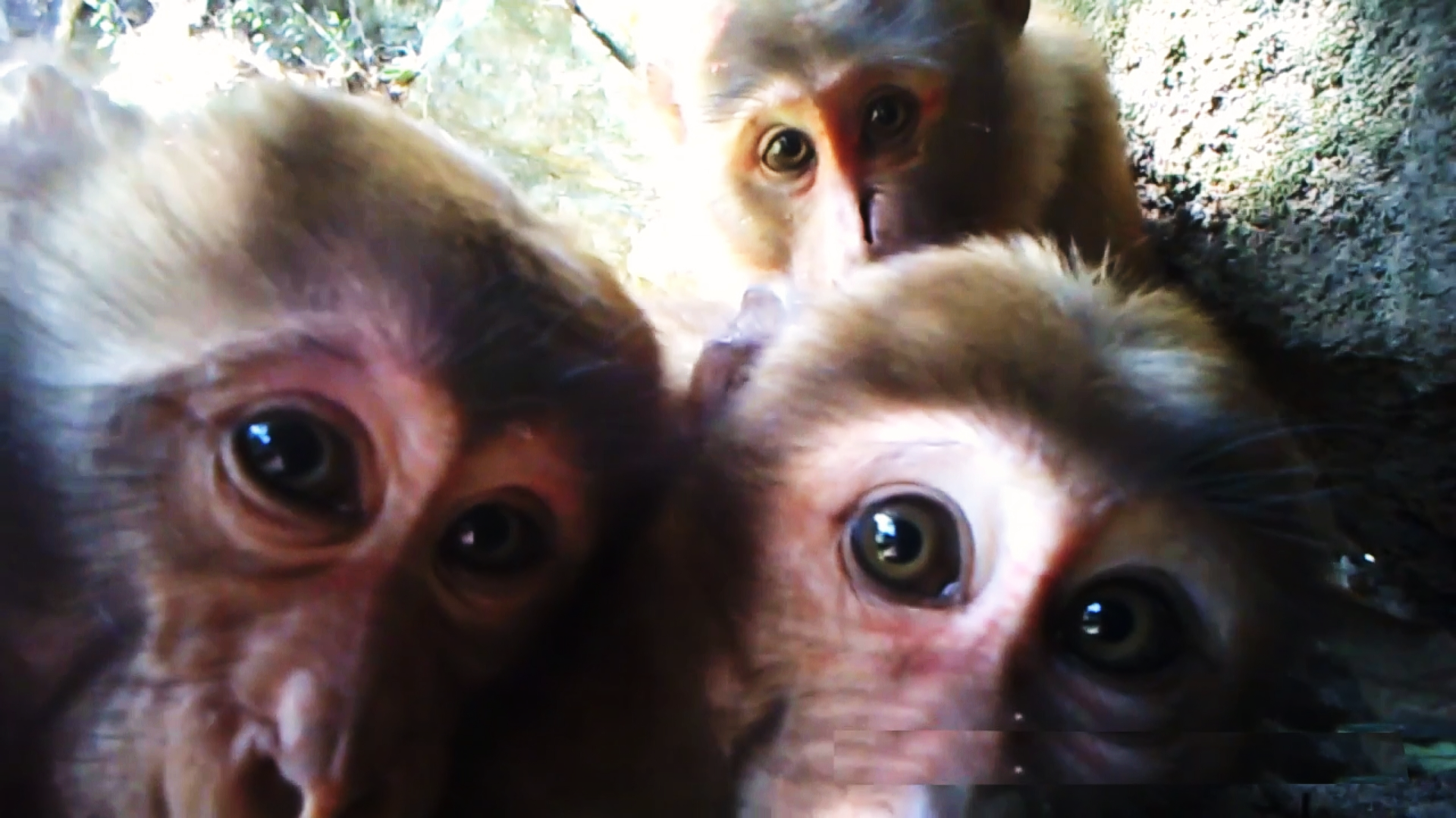 三段视频画面生动呈现了熊猴的野外生活场景。第一段视频中,一群熊猴组团攀岩“炫技”。它们攀爬于一处悬崖峭壁之上,或摇来摆去展示攀爬绝技,或用舌头舔舐岩壁上的天然食盐以补充身体所需的微量元素,或在地上挠痒痒、嬉戏玩耍。第二段视频里,几只熊猴在空中的枝藤间悠闲漫步,随后一只熊猴用前爪拨弄起红外相机,对着镜头摇头晃脑。第三段视频中,几只熊猴争抢着看向镜头,甚至好奇地停留在镜头前“怼脸自拍”,瞬间定格下一张张治愈感十足的画面。
