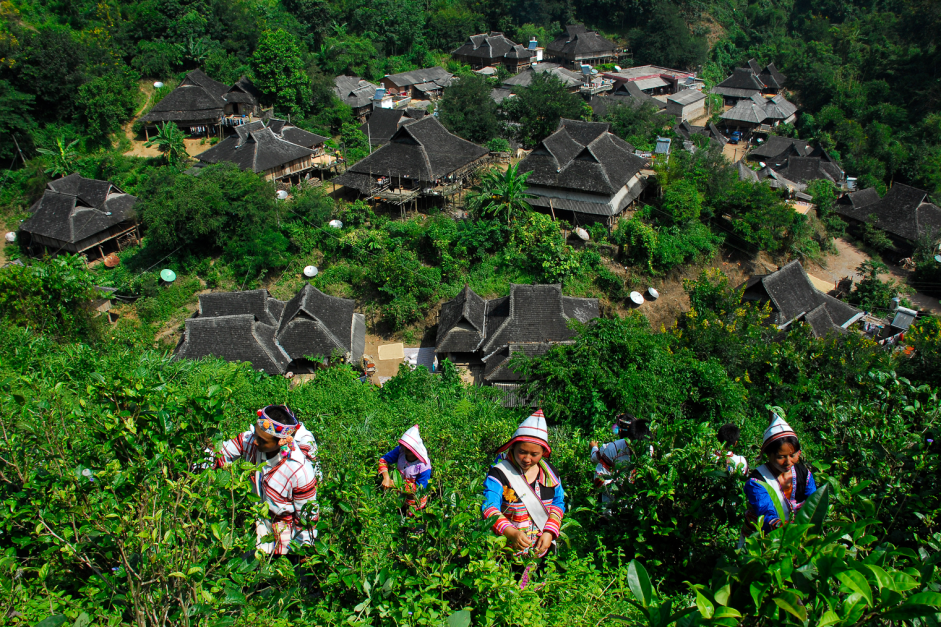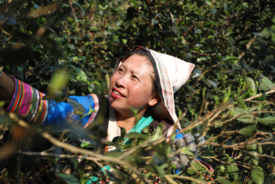 当清晨的第一缕阳光穿透云雾,茶农们背着竹篓,踩着露水,走向深山。在司土老寨古茶园里,茶农动作娴熟地攀上古茶树,采摘着嫩叶。