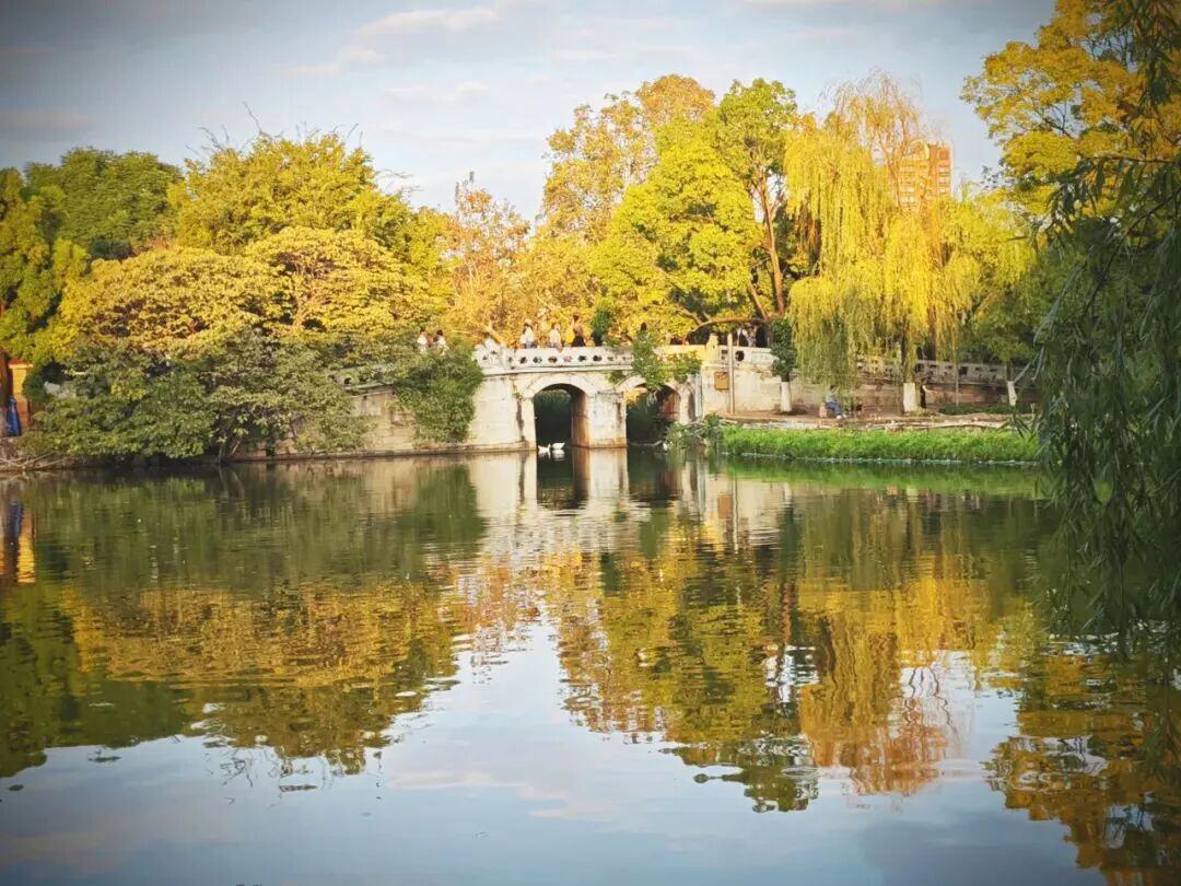 翠湖深处秋景更妙:色彩丰富温暖,屋顶廊檐、门窗在秋叶映衬下古朴厚重。风静时,回廊庭院映于秋水,如梦似幻,有晚照、枯木小桥,似江南。