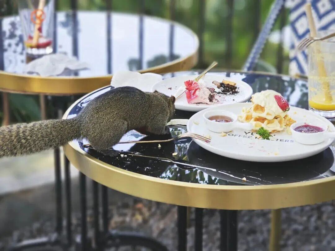 邂逅小松鼠:翠湖的小松鼠胆大,趁人谈话从树上窜下,沿栏杆、椅背跑跳后消失。它们有智慧,客人走后就找吃的,叼起食物后,后爪抓栏杆,尾巴平衡身体,优雅啃食草莓,还能与人合影。