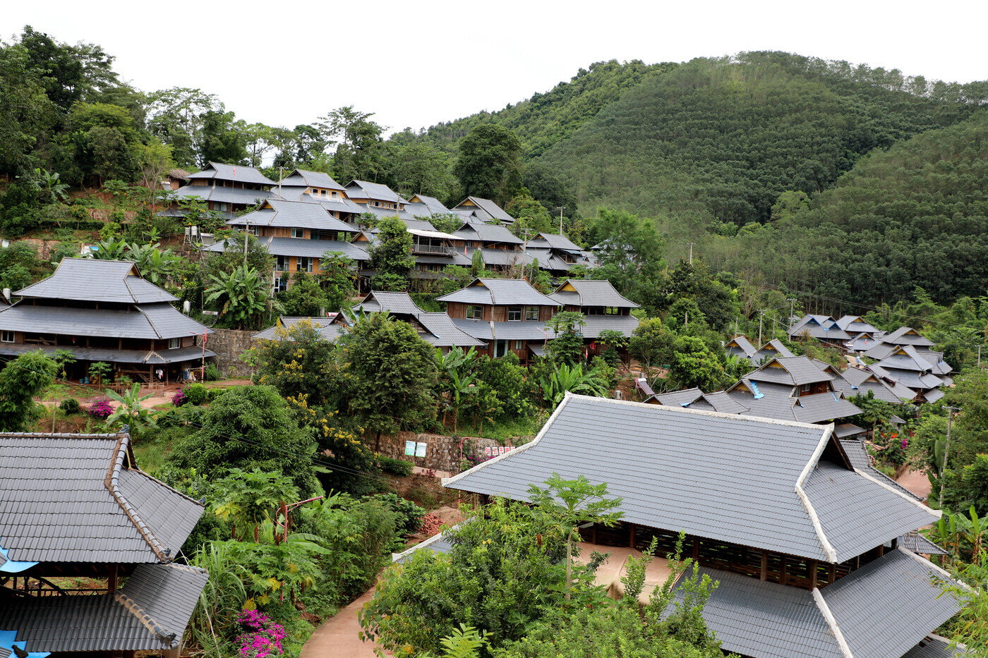 绿植青翠、鲜花竞开,太阳能路灯、分类垃圾箱整齐排列,一幢幢风格统一的瑶家建筑掩映在绿树中,行走其间仿佛游走在画中。这是记者近日走进西双版纳傣族自治州勐腊县勐伴镇河边村看到的景象。