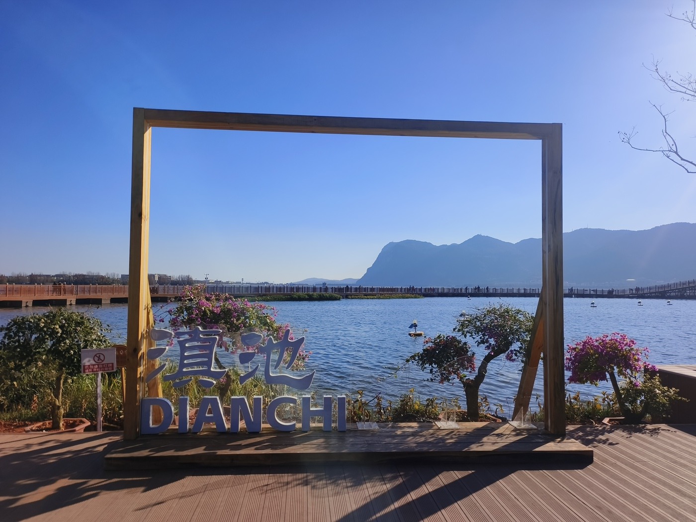 开合浮桥观景台设置的打卡框,在取景框内可同时把滇池和西山“睡美人”“装进”照片里。 李兴文 摄