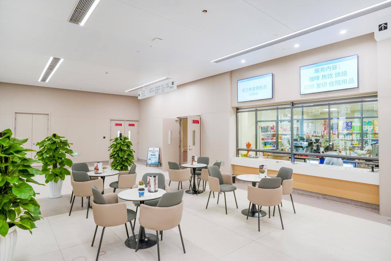 配套周全,优化生活体验。国家呼吸区域医疗中心致力于实现生活支持的网格化覆盖:全院采用分区精准控温的中央空调系统,确保环境恒适;病房门外标配洗手消毒液,强化感染防控;护士站设便民服务箱,备有应急糖果、针线、充电器等日常小物;公共区域配备24小时热水机与微波炉。此外,院内合理布局了便利店、咖啡休闲区:便利店满足日常采购;咖啡区提供舒缓情绪的社交空间。这些设施共同形成了一个支持身体康复与心理调适的暖心生态。
