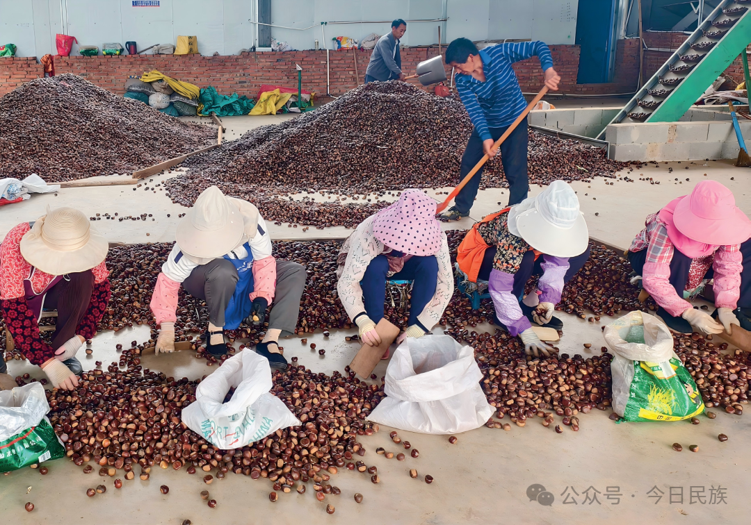 在云南禄劝产业园区相邦食品开发有限公司的交易市场里,满载板栗的车辆络绎不绝,堆积如山的板栗,热闹的交易声和欢笑声,空气里满是丰收的喜悦。禄劝板栗依托当地优越的气候与土壤条件,结合传统种植经验与现代“合作社+科技服务”模式,已成为当地各族群众稳定增收的重要支柱。截至2024年,全县板栗种植面积达26.2万亩,挂果面积15.3万亩,总产量3.6 万吨,产值超2.74亿元,共覆盖1.54万户农户、4.62万人,其中带动6828 户脱贫户、18057人实现了年户均增收5600元。日前,“禄劝板栗”成功斩获国家地理标志保护产品认证,为禄劝县的特色产业发展又注入一强劲动力。