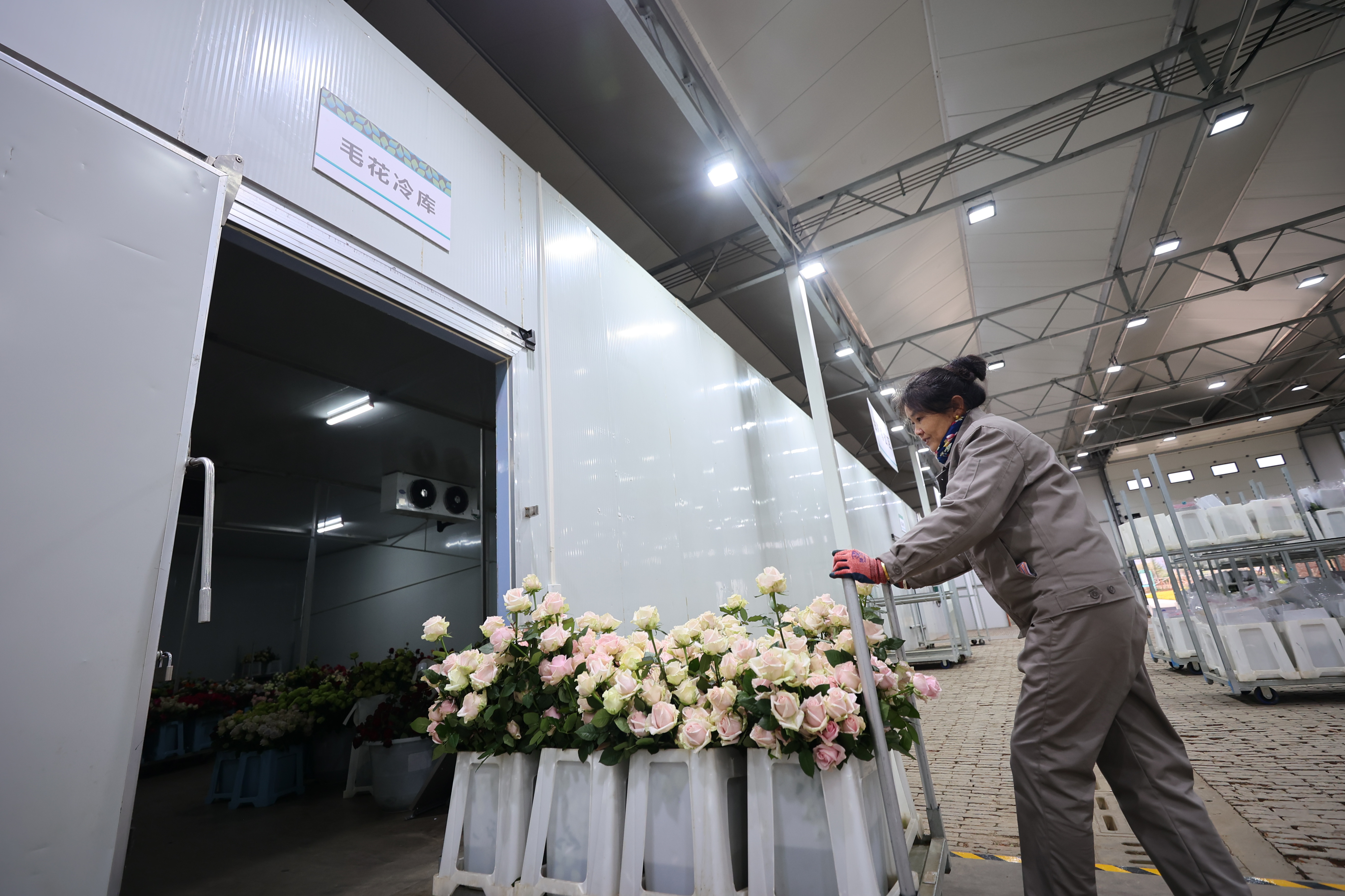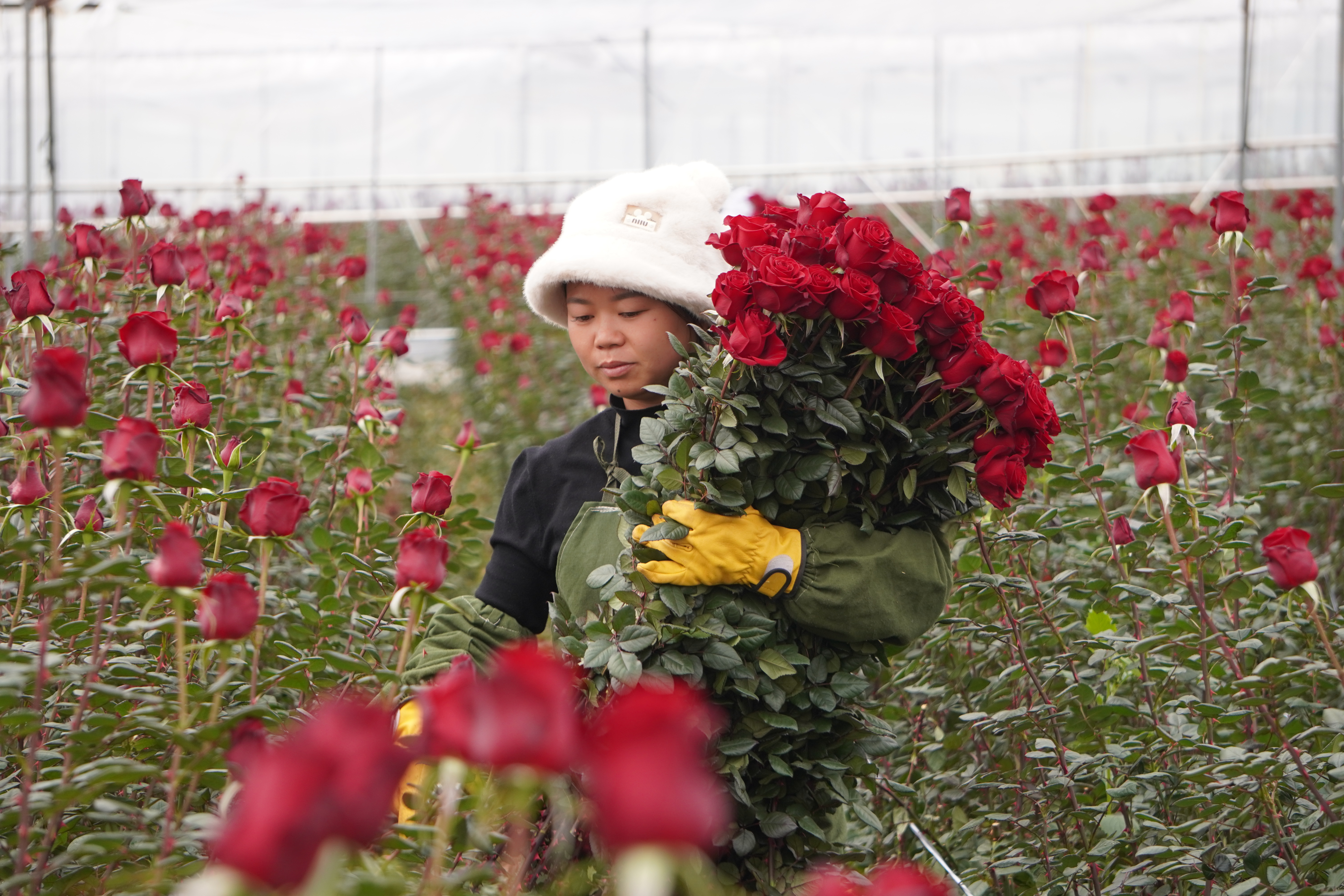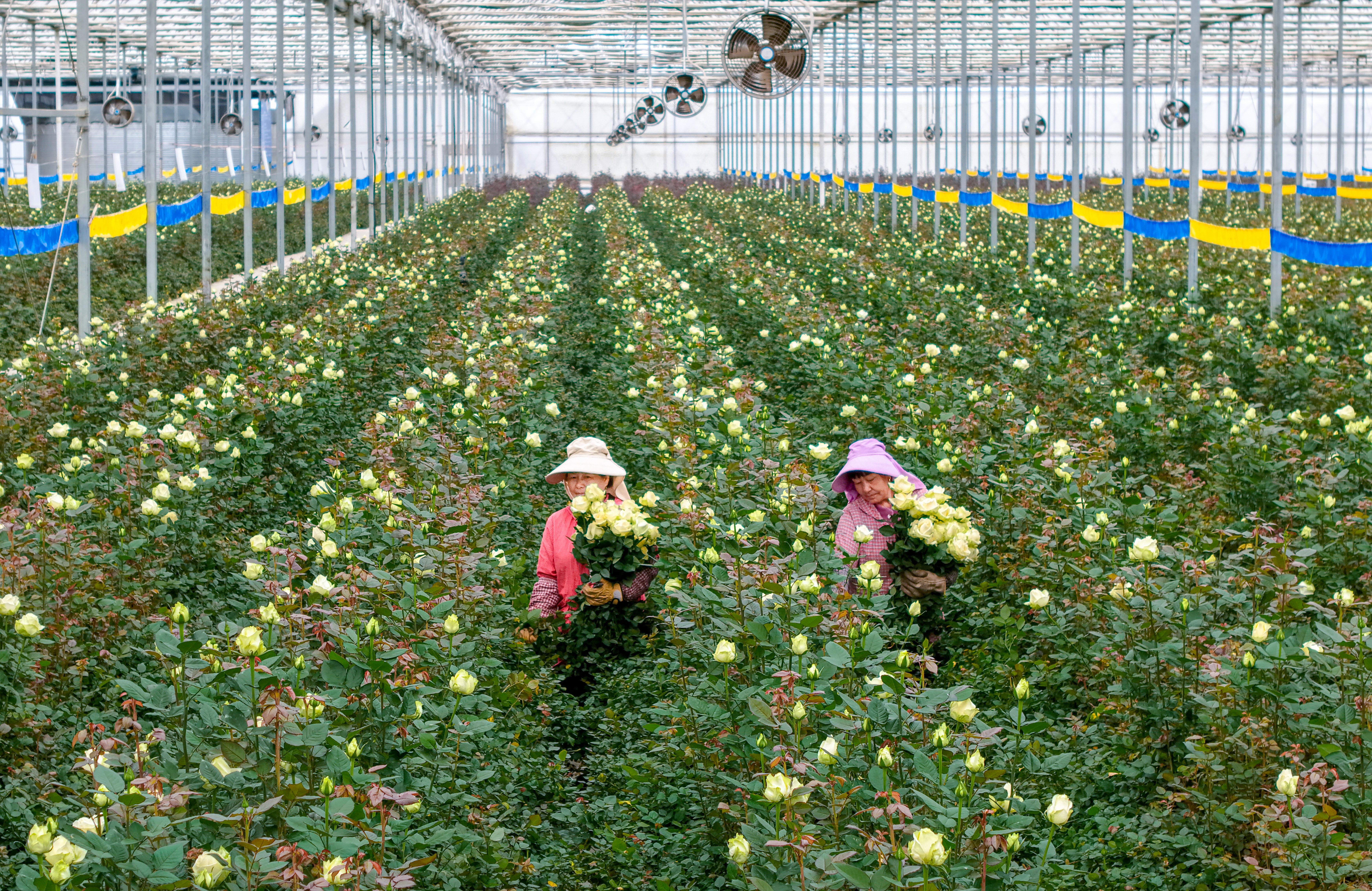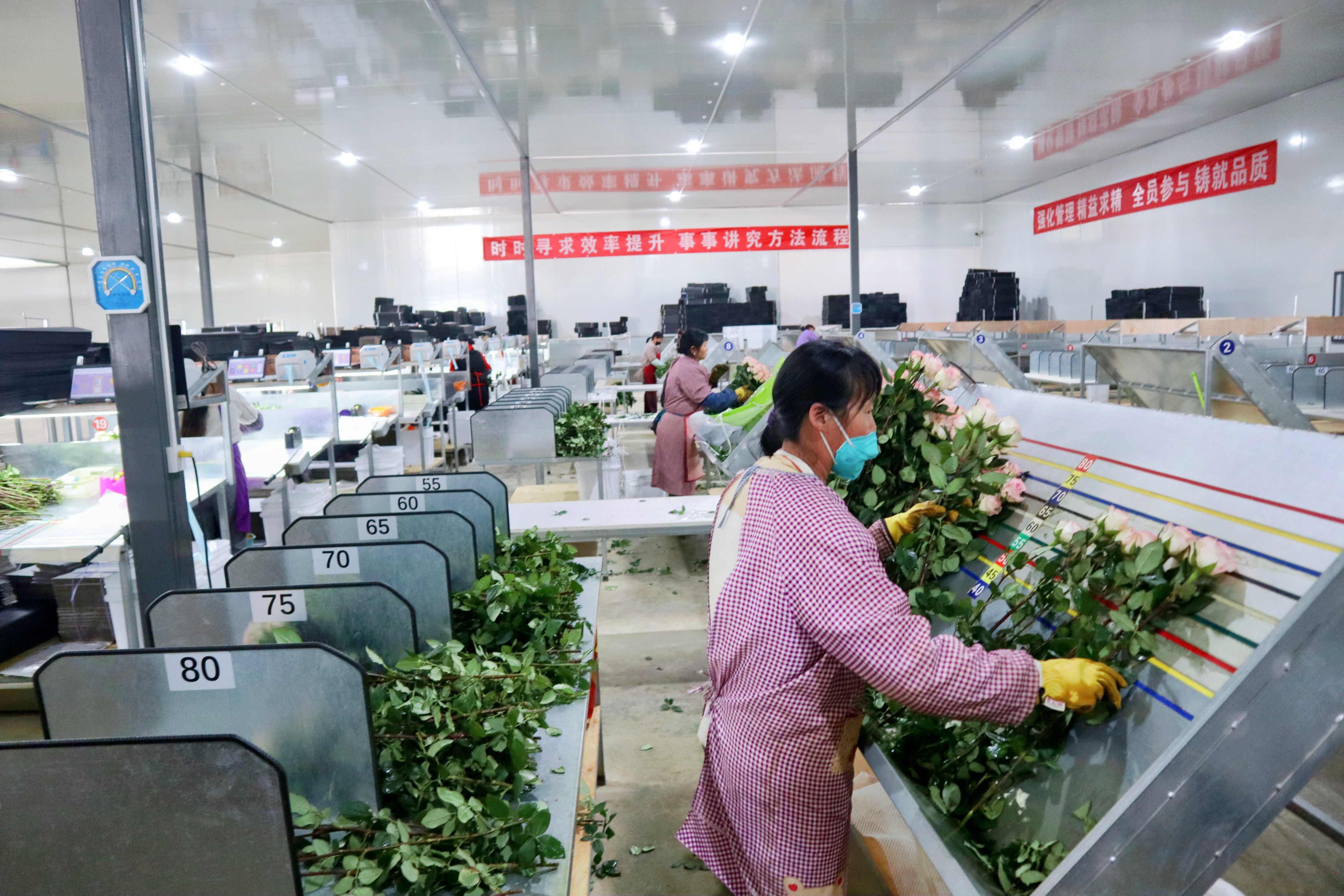 华宁倩之佳花卉行鲜花大棚内工人正在挑选符合标准的玫瑰花 王剑钊 摄