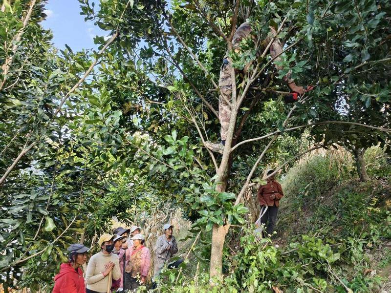腰街彝族乡的坚果林里,一场别开生面的“田间课堂”正在火热进行。技术员围绕整形修剪、科学施肥、病虫害防治三大主题,为30余名村民手把手传授管护技术。“以前舍不得剪枝,现在才知道科学修剪能提高产量。”种植户纪润菊的感慨道出了大家的心声。2025年,腰街彝族乡坚果产量约14吨,为推动产业从“扩面”转向“提质”,乡里瞄准短板开展技术培训,计划打造500亩坚果提质增效示范片,让这片坚果林真正成为群众的“增收林”。村民们一手忙管护,一手忙丰收。
