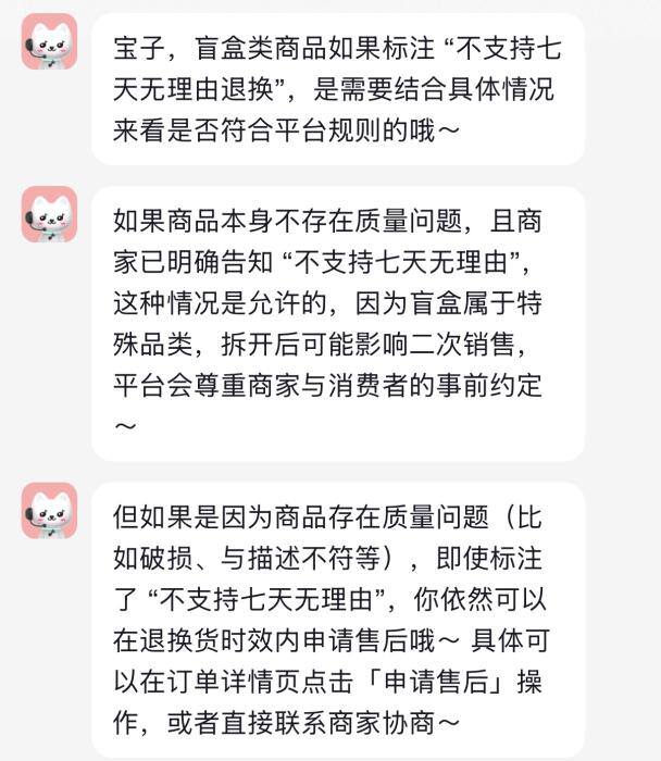 抖音客服明确回复,如果商品本身不存在质量问题,且商家已明确告知“不支持七天无理由退换”,这种情况平台是允许的。因为盲盒属于特殊品类,拆开后可能影响二次销售,平台会尊重商家与消费者的事前约定。