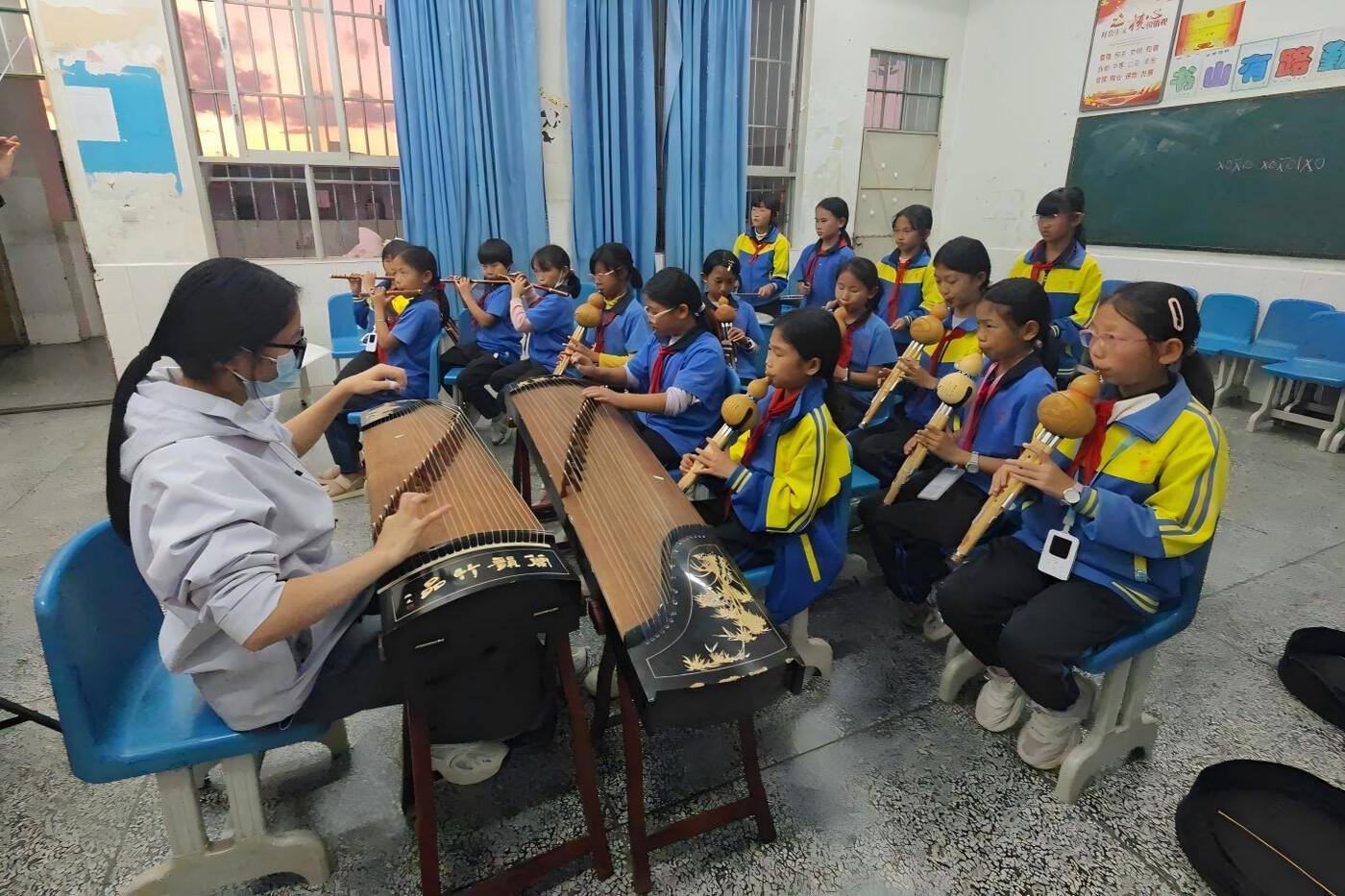 晨光刚漫过山梁,德宏傣族景颇族自治州陇川县民族小学的音乐教室里已传出悠扬的乐声。古筝清越如泉、中阮温润似语、葫芦丝悠扬婉转、中国鼓节奏铿锵,一支由8名小学生组成的民乐团正专注排练原创曲目。孩子们用略显稚嫩却坚定的手法拨动琴弦,额头上沁出细密汗珠。站在他们身旁的昆明城市学院艺术学院支教老师陈家懿轻声鼓励:“别着急,慢慢来,跟着你内心的节奏……”