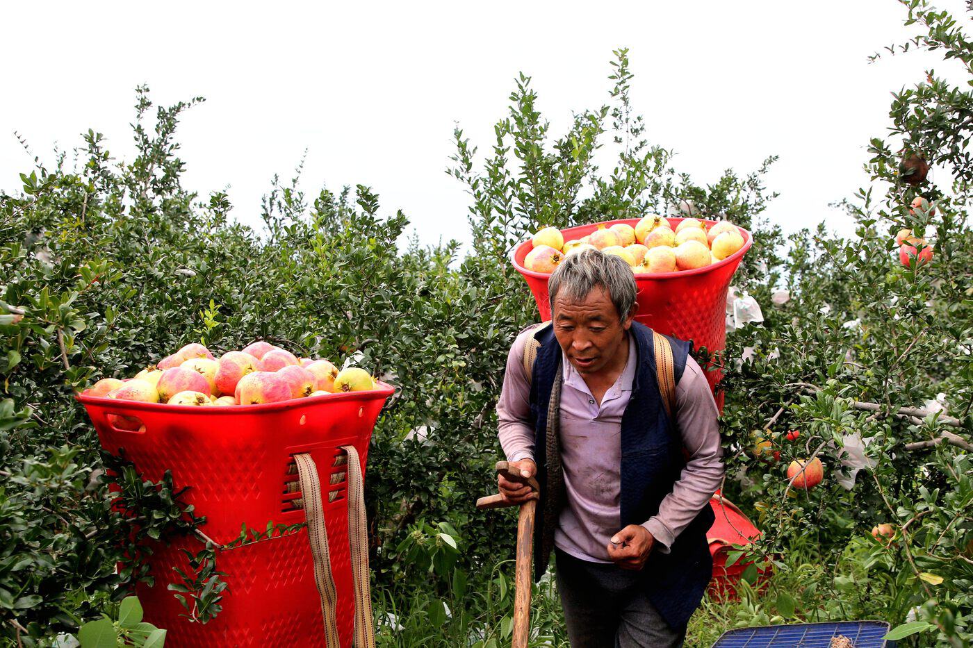 不远处的石榴基地,工人忙着采摘、搬运,小货车在路边等候石榴上车。合作社负责人徐兴奎介绍,他在盐水村流转了1000余亩土地种植石榴,今年的产量还不错,预计可采收1200吨左右。