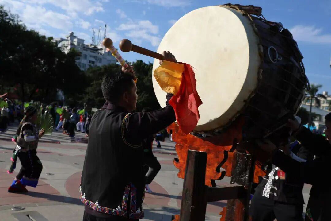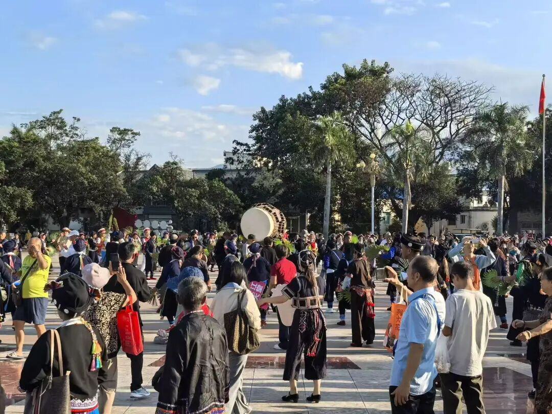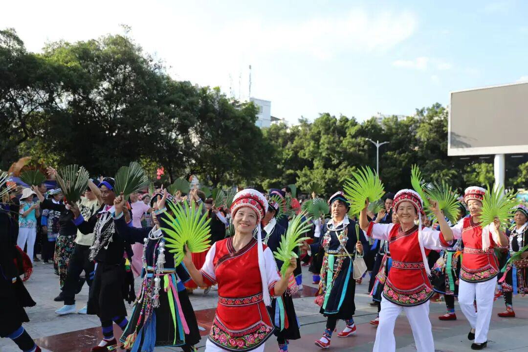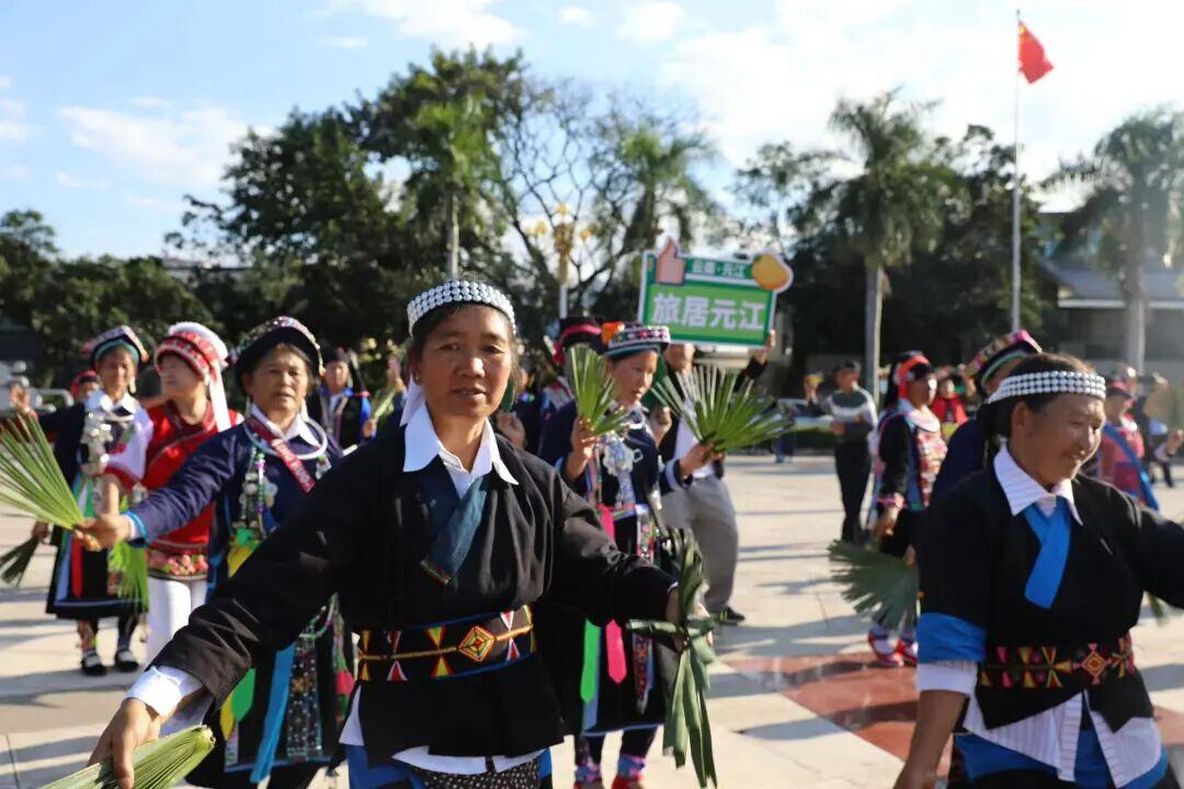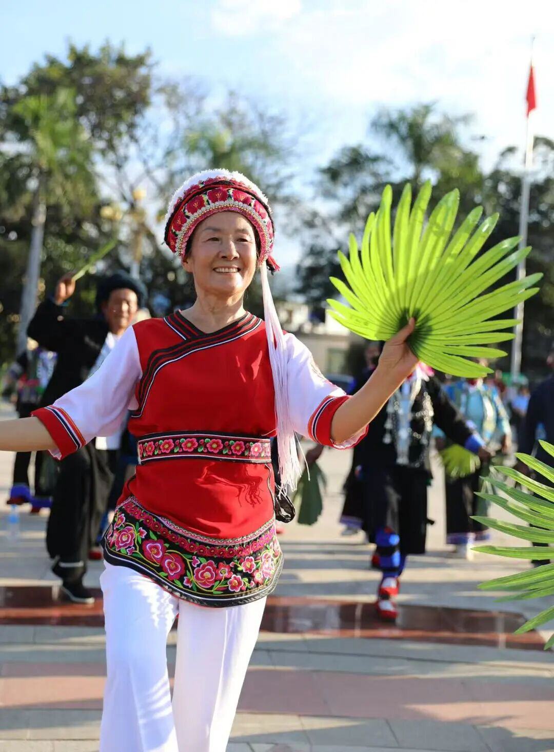 冬日的元江太阳城广场,暖阳高照、气氛热烈。在棕扇舞代表性传承人的带领下,当地哈尼族、彝族、傣族、白族等各族群众身着节日盛装,手持棕扇,围成了一个个同心圆,随着激昂的鼓点与悠扬的音乐翩翩起舞。